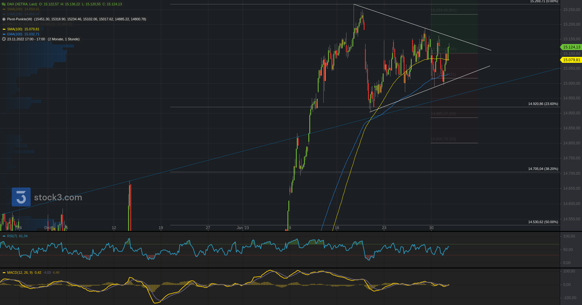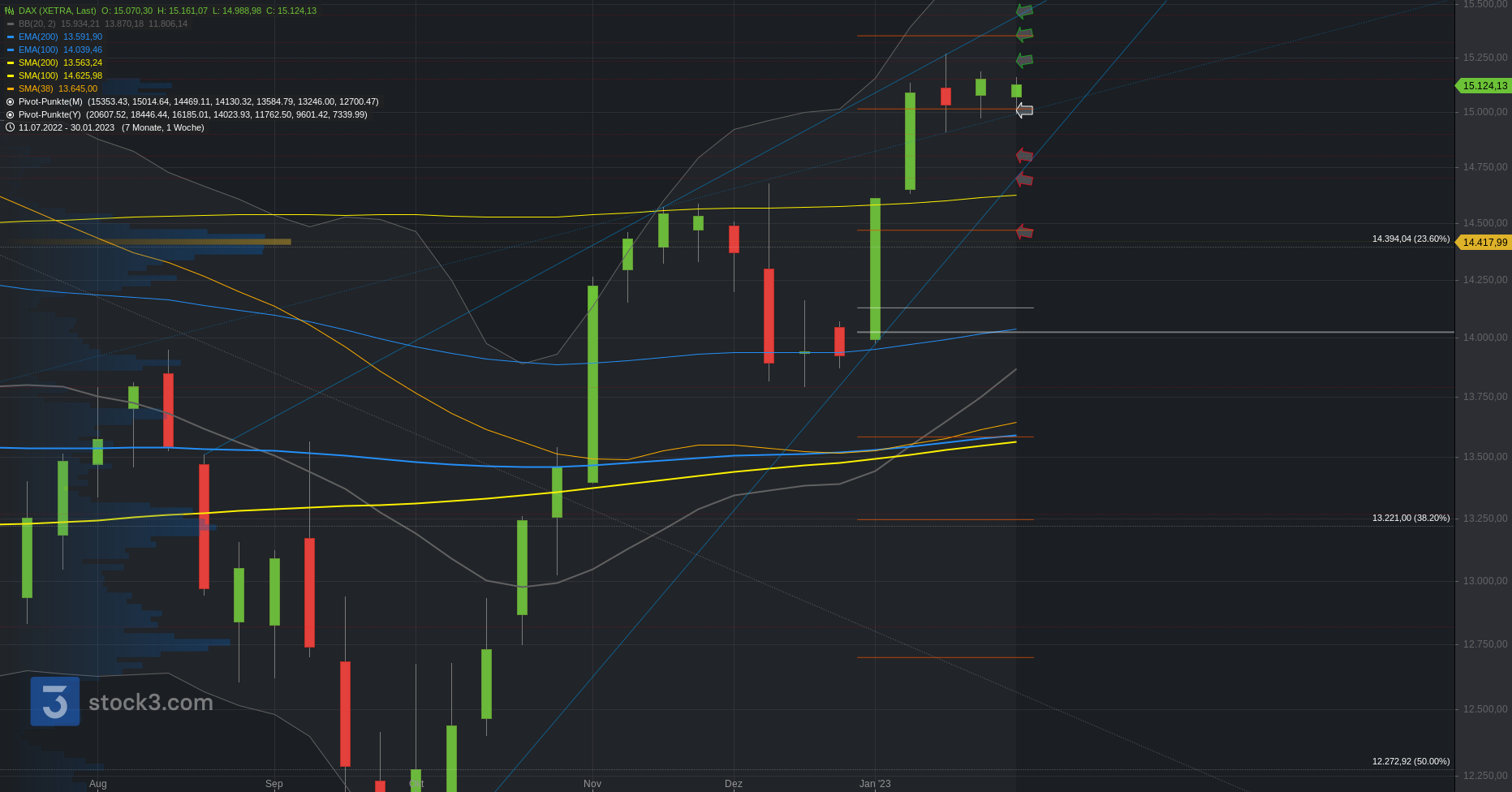 Oberhalb ist ein Cluster über die 15.100/.150 zur .235 aktiv. Darüber Aufhellung zur nächstgrößeren Widerstandszone 15.320/.355. Bei Bruch 15.440.