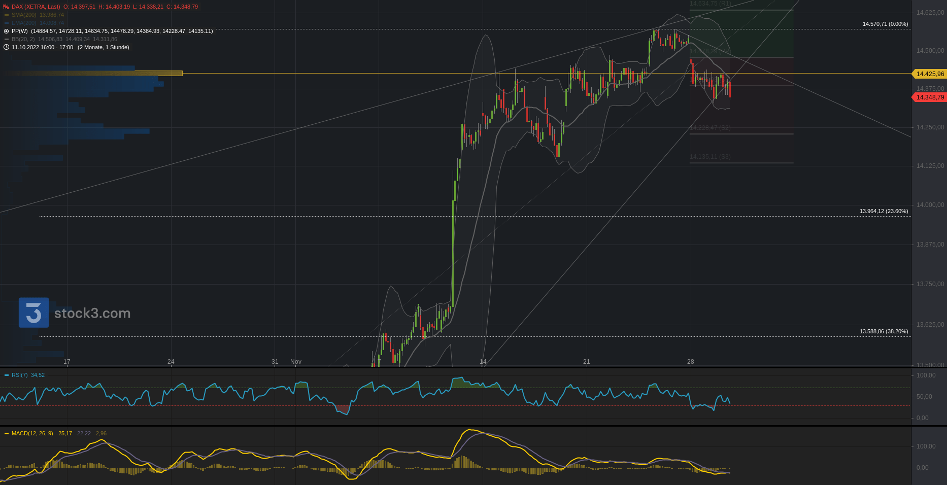 Oberhalb ist ein Cluster zur 14.560 und .630 aktiv. Darüber die Erweiterung zur 14.730 und .800. Bei Bruch 14.885 und anschließend 15k/15.160.