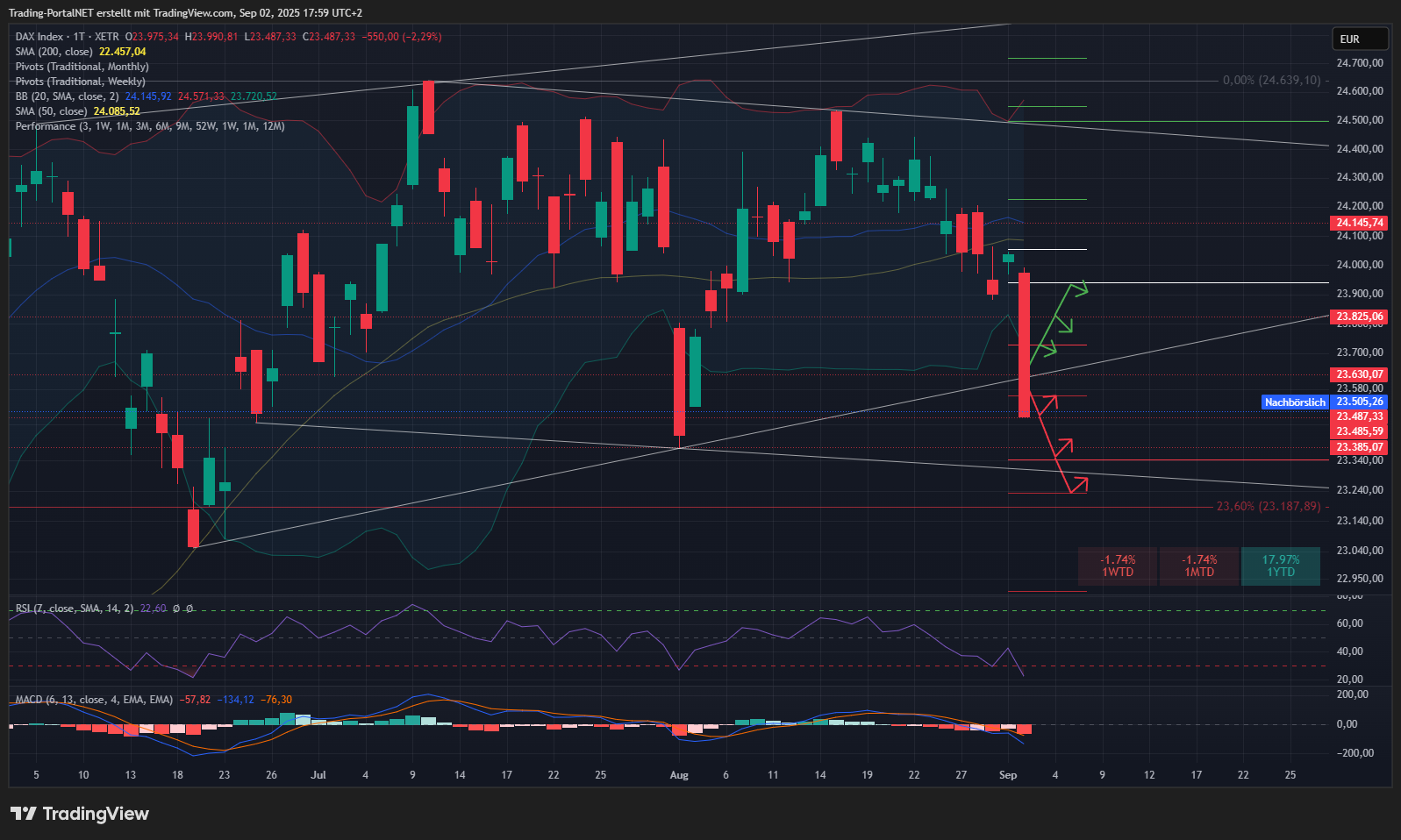 Der DAX geriet zum Start in den September stark unter Druck und hat dabei seine 50-Tageslinie nachhaltig verloren. Die nächste wichtige Supportzone bei 23.400 / 23.300 Punkten rückt damit schnell in den Fokus.