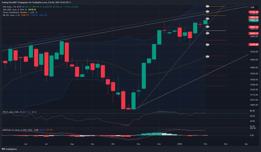Der Blick auf den Wochenchart, wo der DAX seine Bullenflagge nach oben auflösen konnte. Trotz der sehr starken US-Indizes konnte der Index nur mit einem Minus als Doji schließen. Die Konsolidierung innerhalb der Flagge ist mit dem 23,6-er Fibu-Level bisher nur sehr flach verlaufen und hält die Wahrscheinlichkeit am Leben, dass der Flaggenausbruch noch zur eigentlichen Konsolidierung gehört und ein vorzeitiges Ende finden wird. Saubere Konsolidierungsziele nach der Novemberrallye sollten eigentlich bis unter die 16k führen. Bei aufkommender Dynamik über die 17.1 muss jedoch davon ausgegangen werden, dass die Konsolidierung in der Tat flach beendet wurde und ein neuer Aufwärtsimpuls bereits läuft. Ein Türöffner zur 17.4 müsste dann eingeplant werden. Die 16.850 stellen den ersten relevanten Bereich auf Wochensicht. Oberhalb bleibt die Range zum AZH und 17.080 aktiv. Anschließend 17.240. Bei Bruch 17.4. Unterhalb wäre hingegen der Cluster über die 16.5 zur 16.350 zu nennen. Darunter dürfte die Konsolidierung zur 16.050 (m. Bollinger) fortgesetzt werden.