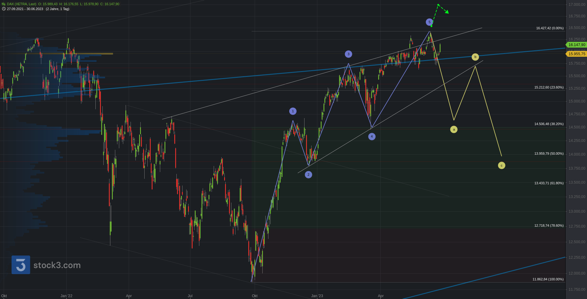Oberhalb bleibt ein erster Cluster über die 16.1 zur 16.180 aktiv. Darüber folgen 16.270 und .310. Bei Bruch 16.360/.420 und das neue AZH an der 16.470.