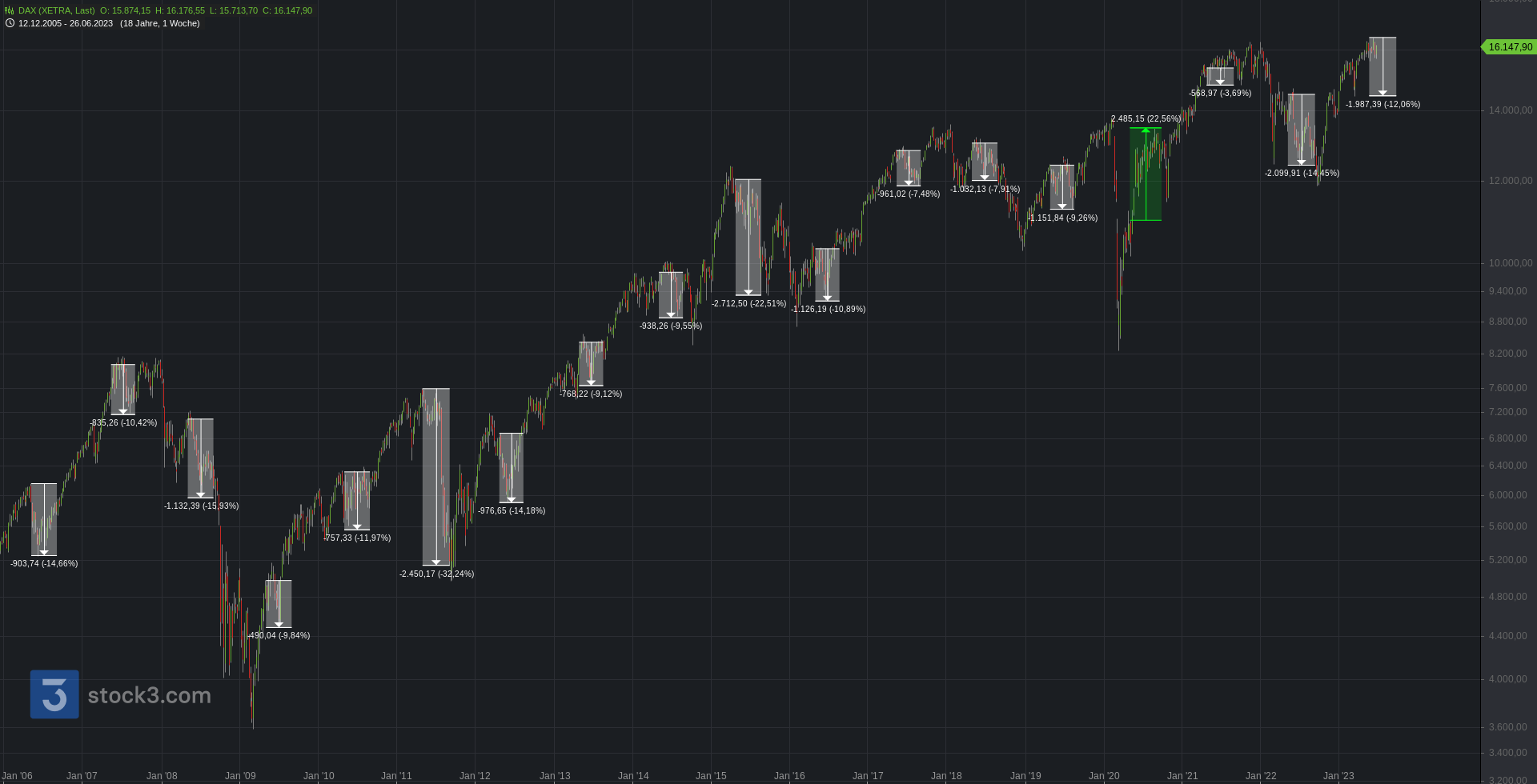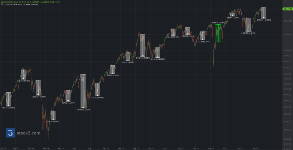 Direkt zu Beginn der Blick zur Saisonalität. Eine der bekanntesten Börsenweisheiten lautet „Sell in May and go away, but remember to come back in September.„. Der nachfolgende Chart, wo der genannte Zeitraum für die letzten 15 Jahre markiert wurde, stellt dar, dass diese Weisheit durchaus ihre Daseinsberechtigung hat. Sehr häufig gab es zwischen Mai und September den stärksten Rücksetzer des Gesamtjahres; selbst innerhalb der Rekordhausse. Eine große Ausnahme stellte das Pandemiejahr 2020 dar, als der DAX innerhalb der schwachen Saisonalität stark zulegen konnte. Vor dem Hintergrund der Straffungspolitik der Notenbanken und dem Stagflationsszenario könnte die Börsenweisheit erneut um Gehör bitten.