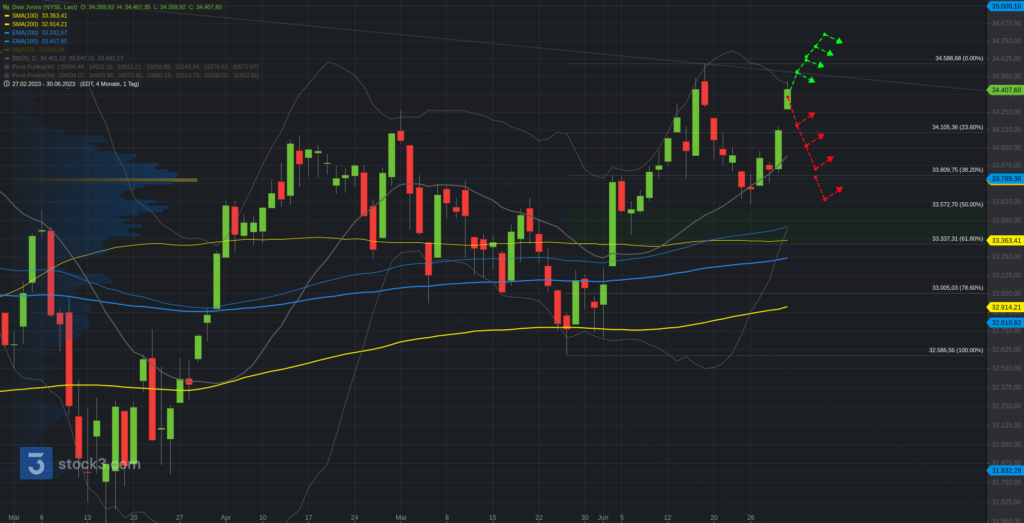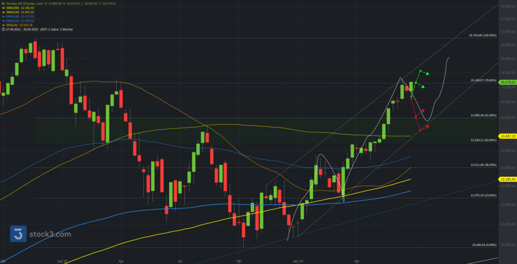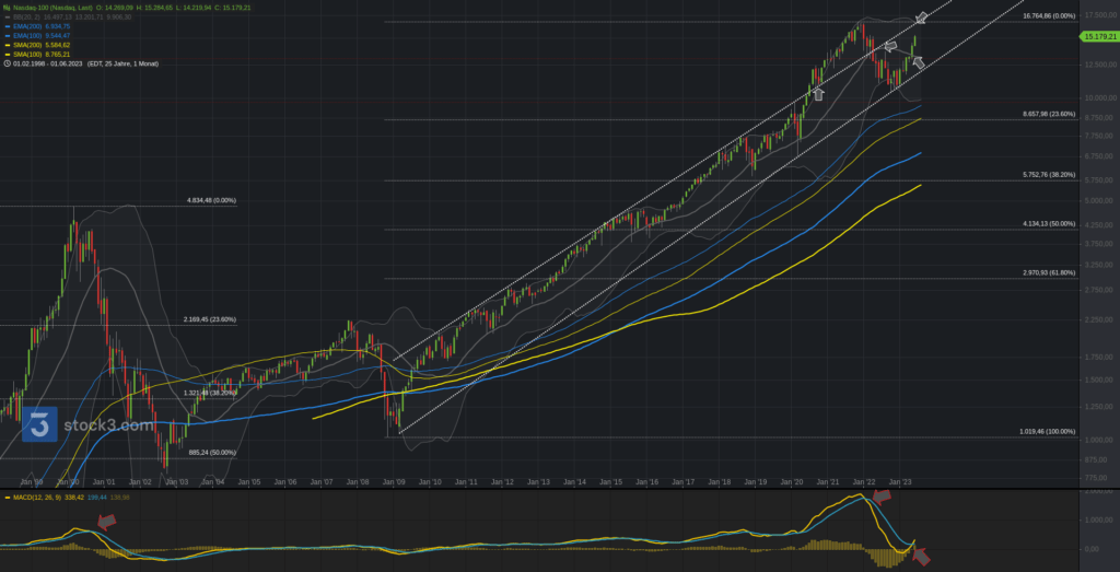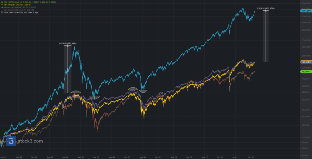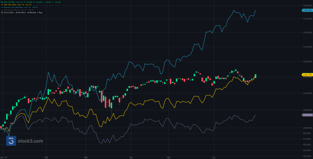 Wir beginnen die Chartreihe mit einem Performancevergleich zwischen Nasdaq100 (blau), S&P500 (gelb), Dow Jones (lila) und DAX seit Jahresbeginn 2023. DAX (+15,98%), S&P500 (+15,91%), Dow Jones (+3,80%) und Nasdaq100 (+38,75%).
