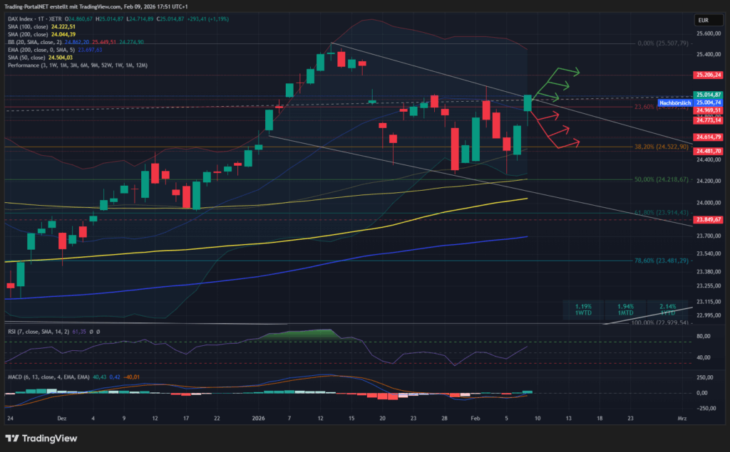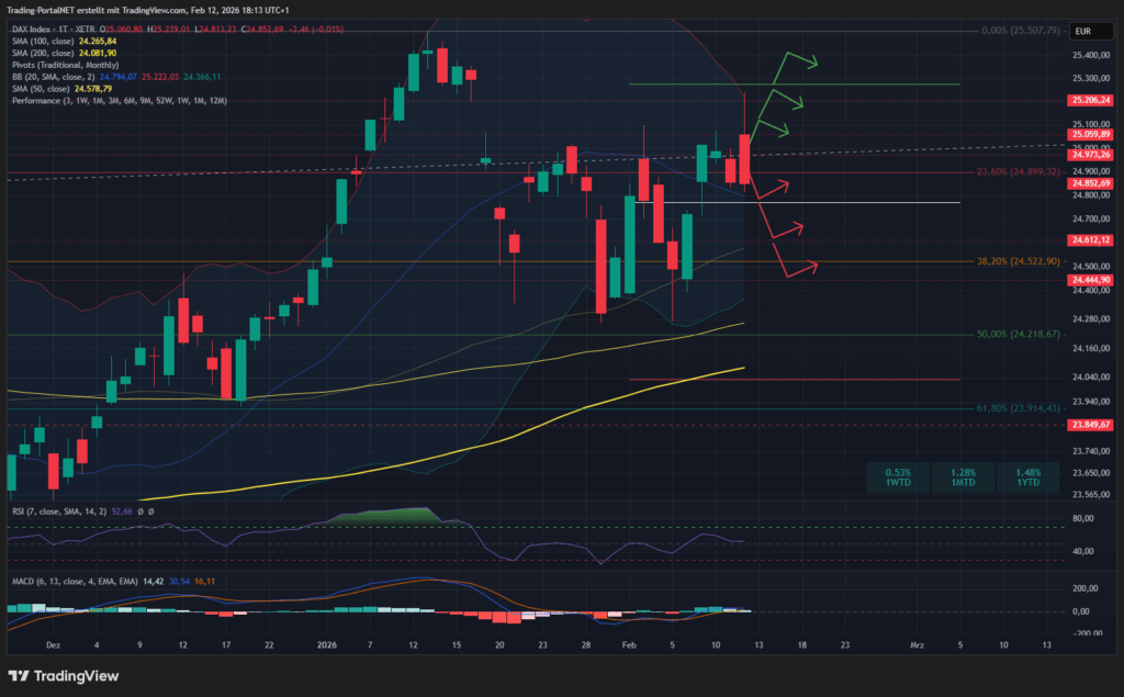 - Oberhalb wäre die Spanne zur 24.960 und 25.000 weiter aktiv. Darüber gelingt wieder der Sorg über zur 25.075 in die 25.200. Anschließend Türöffner zur 25.280/.330.