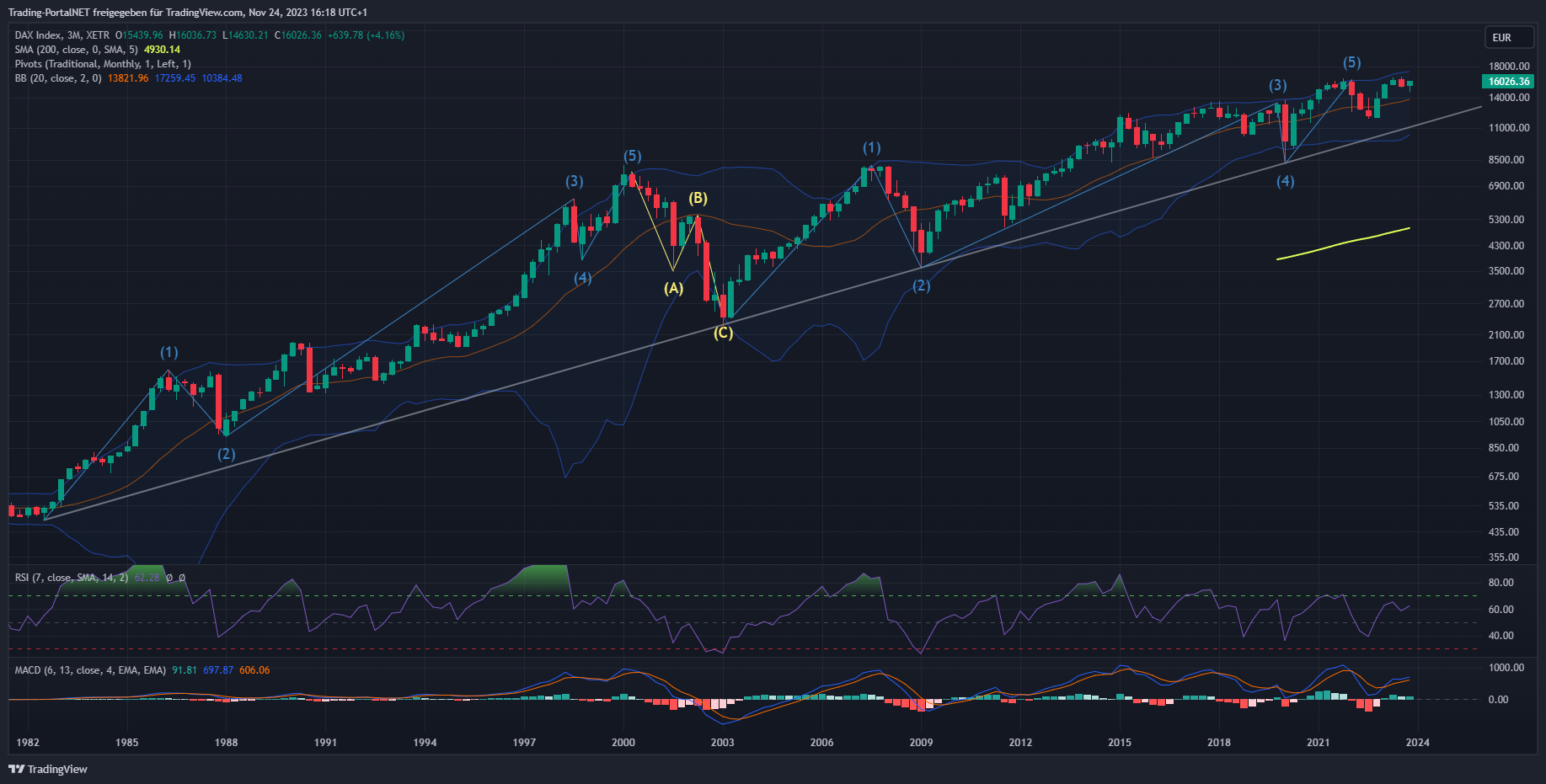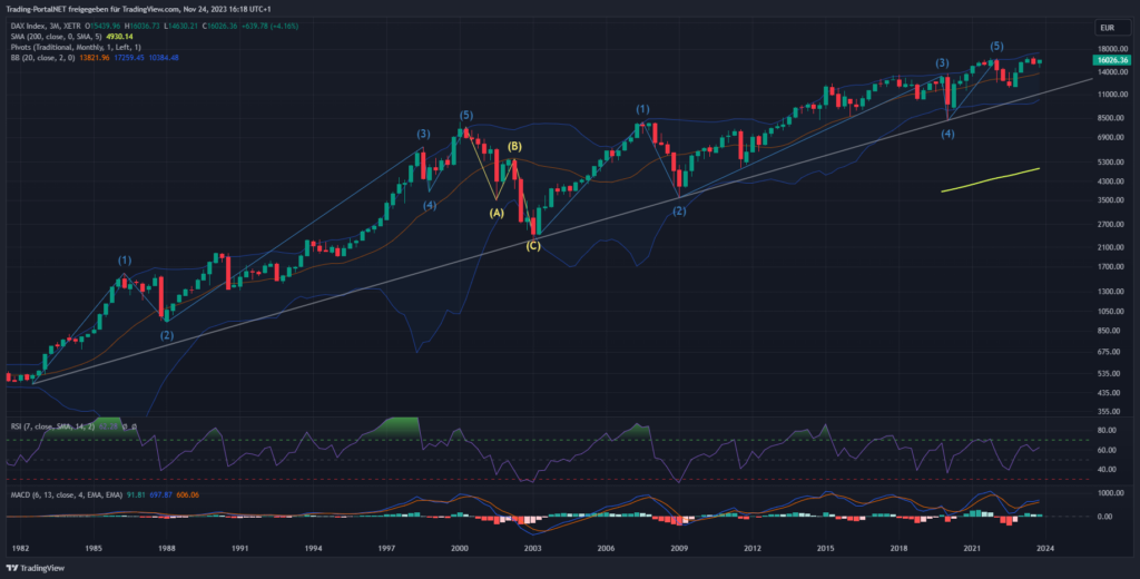 Der weitere Blick zum DAX Quartalschart (jede Kerze stellt ein Quartal dar) seit den 1980-er Jahren. Während Corona wurde der 40-jährige Aufwärtstrend getestet und verteidigt. Obere Begrenzungslinie und 2022-er Begrenzungslinie bremsen die DAX-Rally (von Oktober 2022) momentan aus.