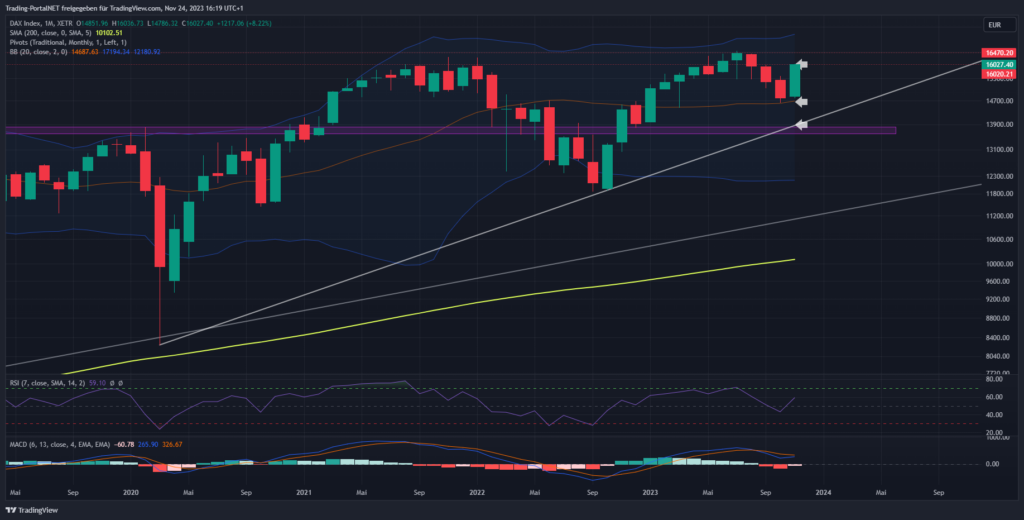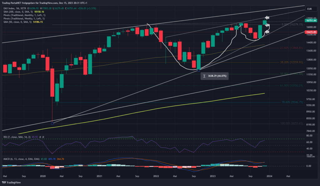 Der Blick zum DAX Monatschart. Zu sehen der Corona-Crash und die nachfolgende Rallye, welche 2022 bullisch konsolidiert und ab Oktober 2022 bullisch aufgelöst wurde. 2023 hat sich zudem eine Cup & Handle ausgebildet, die eine gute bullische Grundlage für 2024 darstellt. Oberhalb der 17.1 würden sich direkt weitere Zugewinne anbieten. Unterhalb muss ein Zwischenschritt eingeplant werden. 16.6 – 16.2 – 15.6 wäre ein gesundes Verlaufsmuster.