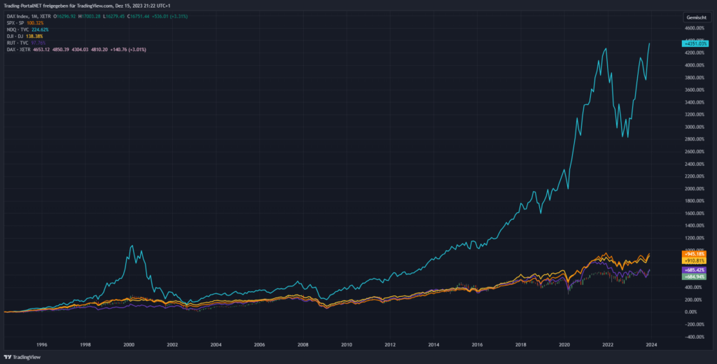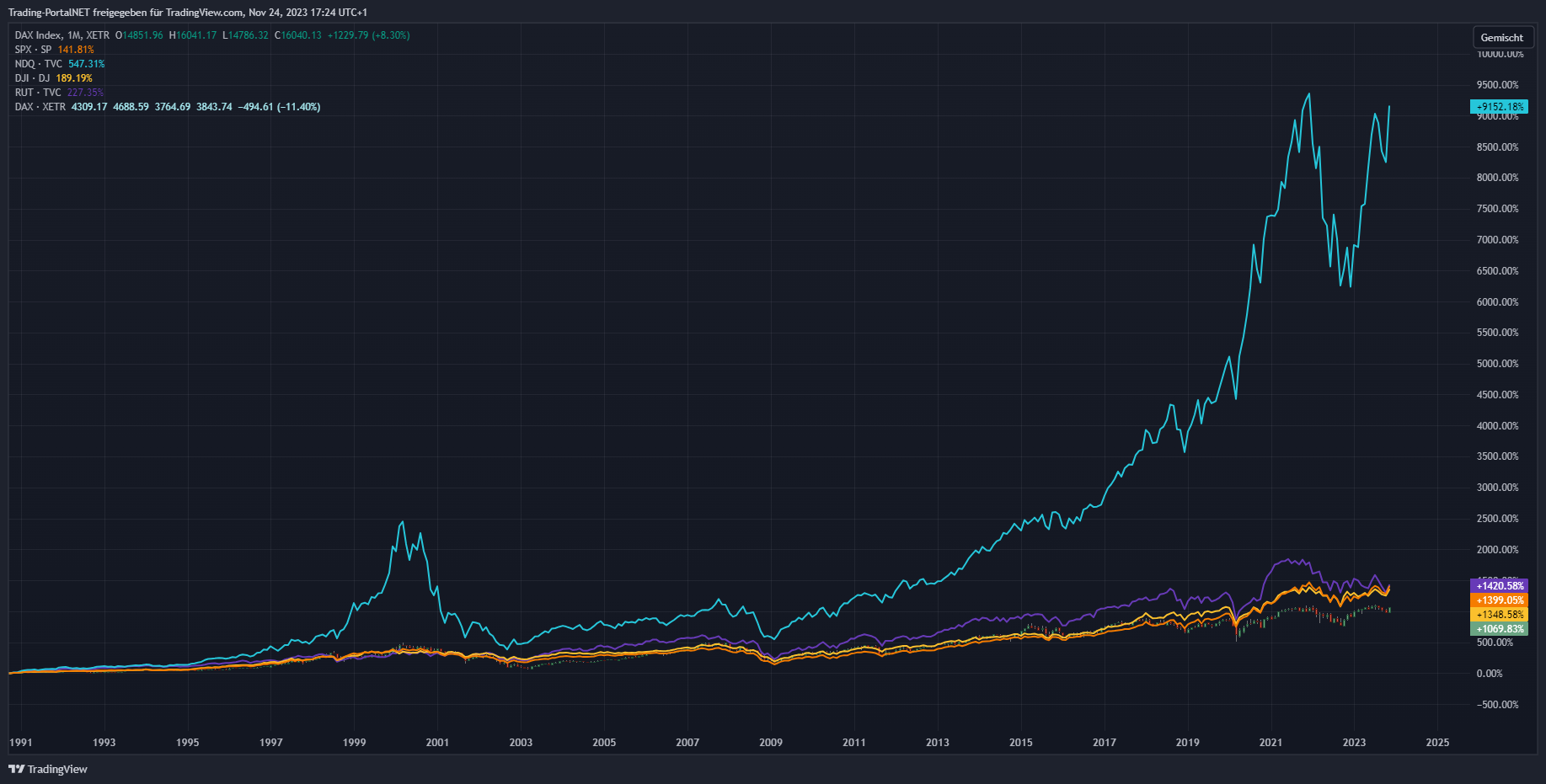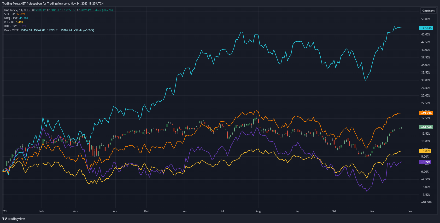 Wir beginnen die Chartreihe mit einem Performancevergleich zwischen Nasdaq100 (blau), S&P500 (gelb), Dow Jones (lila) und DAX seit Jahresbeginn 2023. DAX (+20,4%), S&P500 (+19,9%), Dow Jones (+9,4%) und Nasdaq100 (+47,2%).