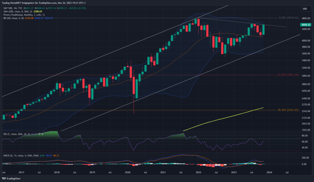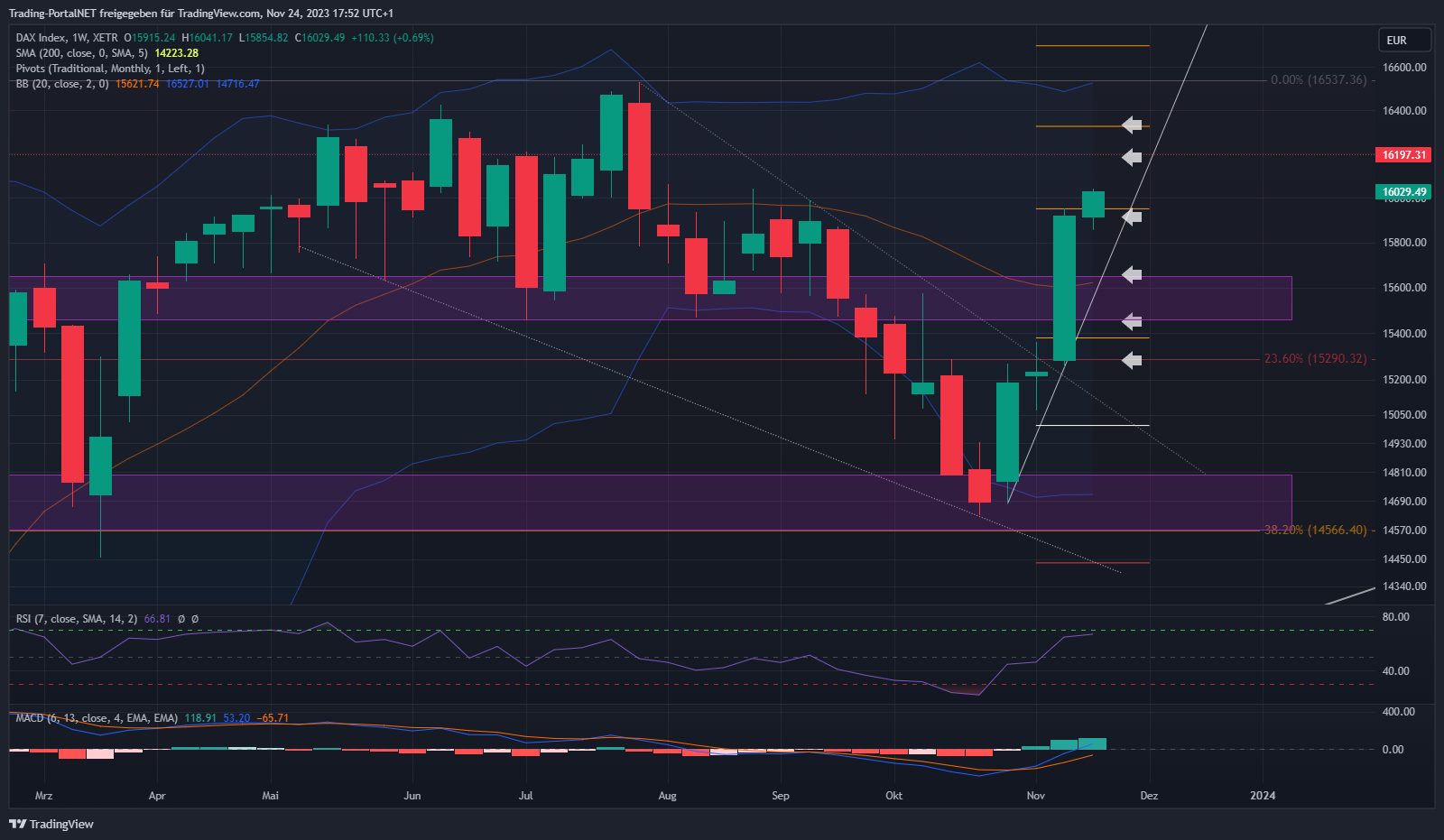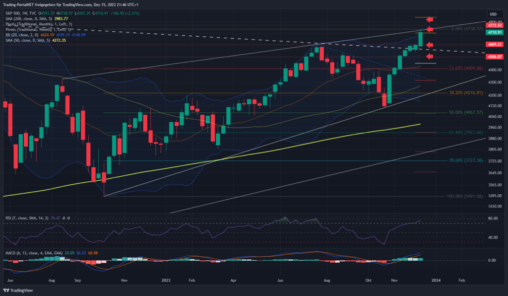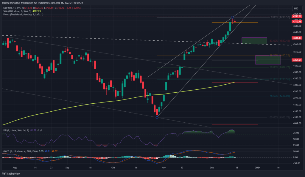 Ein kurzer Blick in den US-Markt (Komplette Updates für den US-Markt gibt es auf Trading-Portal.NET – Premium) ins übergeordnete Bild. Der S&P500 mit nun 7 Gewinnwochen in Folge. Obere Verbindungslinie von 2022 wurde bei 4.740 getestet. Unterhalb könnte sich der Kurs Richtung Feiertage gemütlich einpendeln. Ein Cluster 4.7 – 4.6 würde sich anbieten. Unterhalb würde sich die Konsolidierung direkt zur 4.560 – 4.510 ausdehen. Oberhalb besteht über die 4.770 die Chance auf ein neues Allzeithoch bei 4.840. Den detaillierten Ausblick gibt es im Dashboard tagtäglich aktuell.