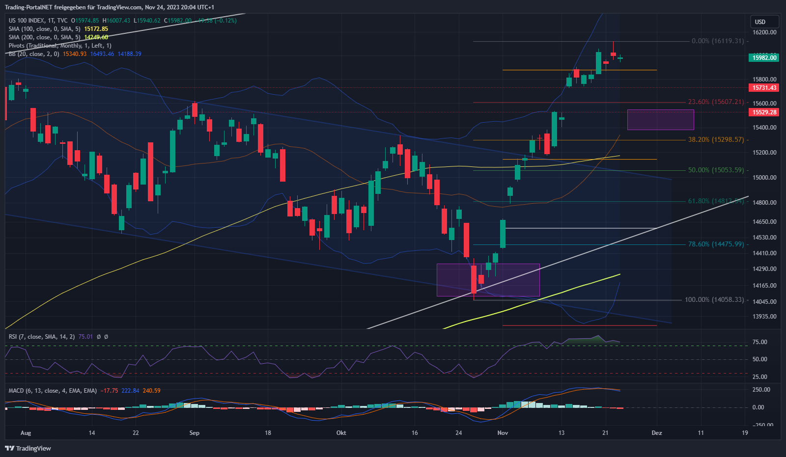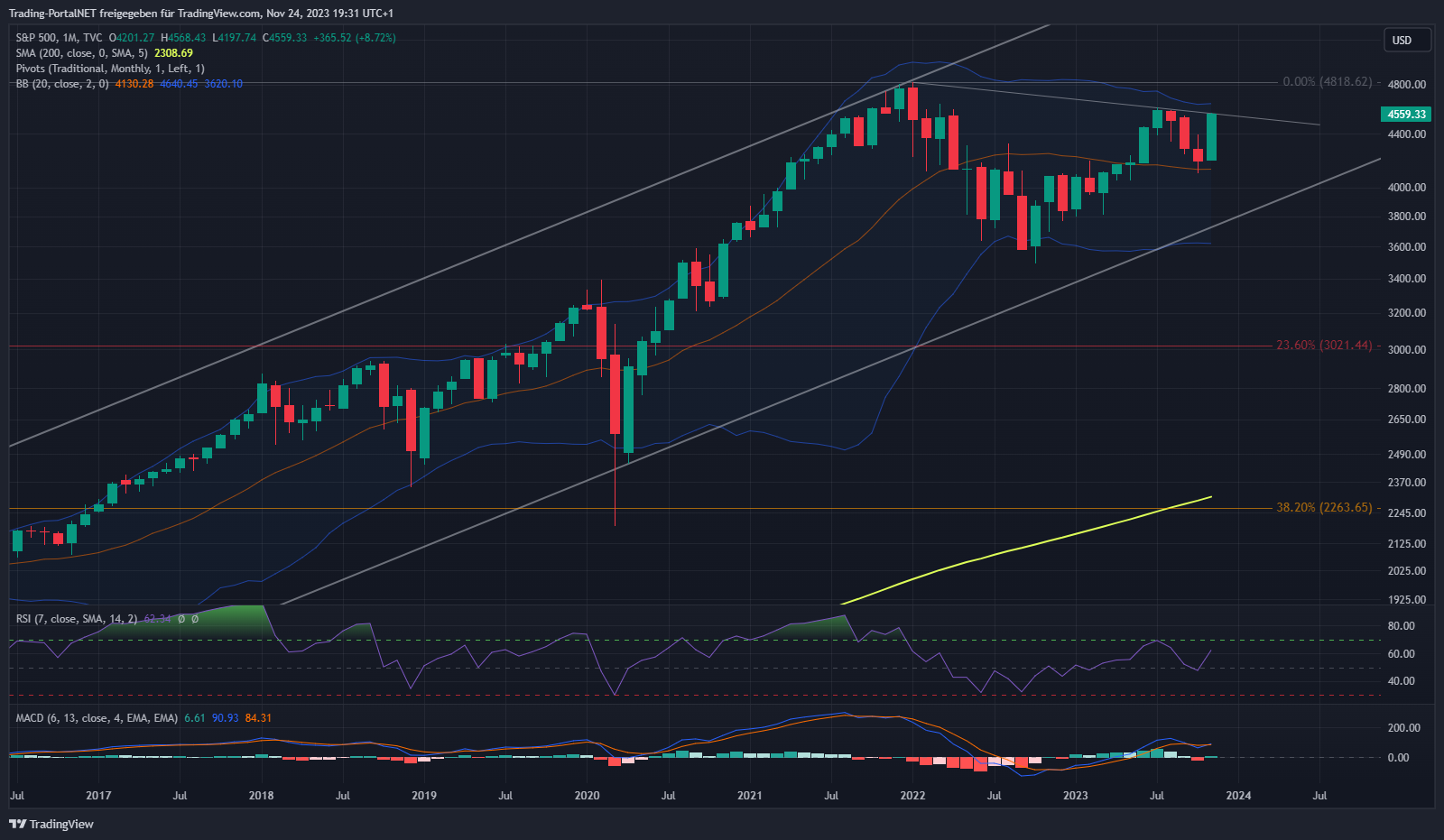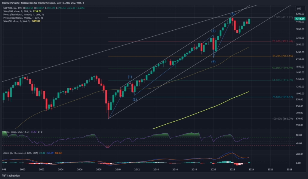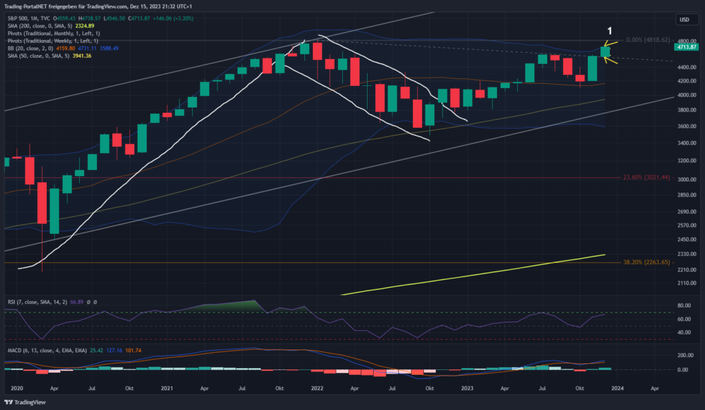Ein kurzer Blick in den US-Markt (Komplette Updates für den US-Markt gibt es auf Trading-Portal.NET – Premium) ins übergeordnete Bild. Der S&P500 mit nun 7 Gewinnwochen in Folge. Obere Verbindungslinie von 2022 wurde bei 4.740 getestet. Unterhalb könnte sich der Kurs Richtung Feiertage gemütlich einpendeln. Ein Cluster 4.7 – 4.6 würde sich anbieten. Unterhalb würde sich die Konsolidierung direkt zur 4.560 – 4.510 ausdehen. Oberhalb besteht über die 4.770 die Chance auf ein neues Allzeithoch bei 4.840. Den detaillierten Ausblick gibt es im Dashboard tagtäglich aktuell.