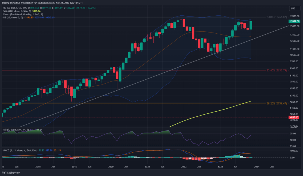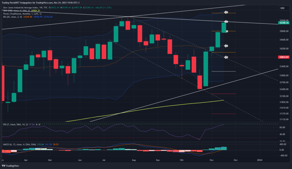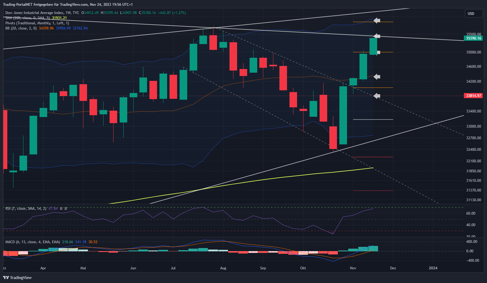 Der Dow Jones mit +15% und neuem Allzeithoch in 7 Gewinnwochen. Impuls erinnert sehr an die Impulsbewegung von exakt vor einem Jahr (Oktober – Dezember). iSKS-Ziel erreicht und Widerstandszone 37.5. Bei Top-Bildung wird eine Konsolidierung zur 35.5/35k wahrscheinlich. Zwischenziele 37k, 36.3. Oberhalb der 37.5 müsste noch die 38k eingeplant werden.