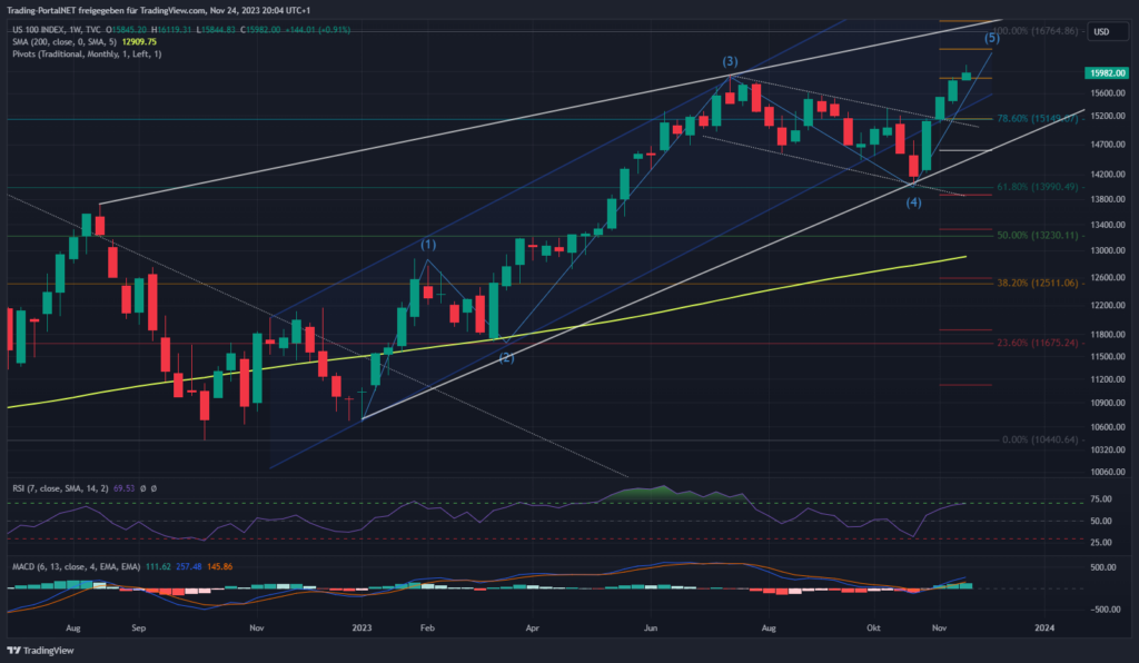 Der Nasdaq100 hält seit Oktober 2022 einen neuen Impuls aktiv. Die 5. Abschlusswelle wurde November 2023 eingeleitet und ist bisher noch intakt, allerdings bereits ausreichend gut ausgeprägt. In der 2. Dezemberhälfte sind größere Schwächephasen sehr selten und so könnte der NAS noch leicht zur 17k zulegen und in eine Top-Bildung übergehen. Abschluss der 5. Welle öffnet die Tür für eine mehrwöchige Konsolidierung (von der Anstiegsbewegung Okt `22). Ziele an die 14k und 13k wären nicht ungewöhnlich und würden ins übergeordnete bullische Muster passen. Oberhalb der 16.6 bestehen noch direkte Anstiegschancen zur 17k und im weiteren Verlauf 17.250. Unterhalb der 16k wird es toppish.