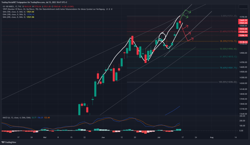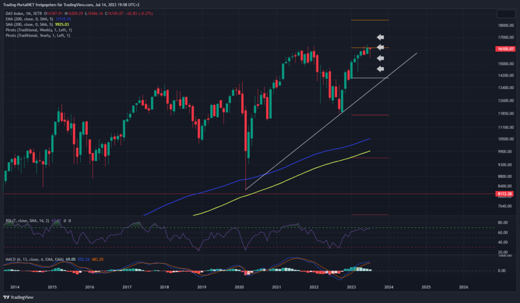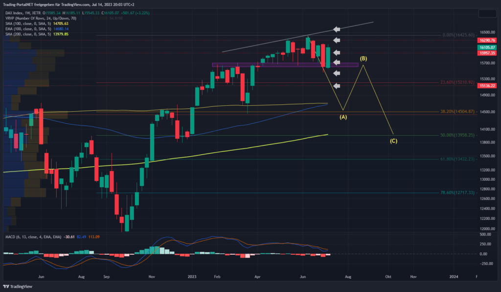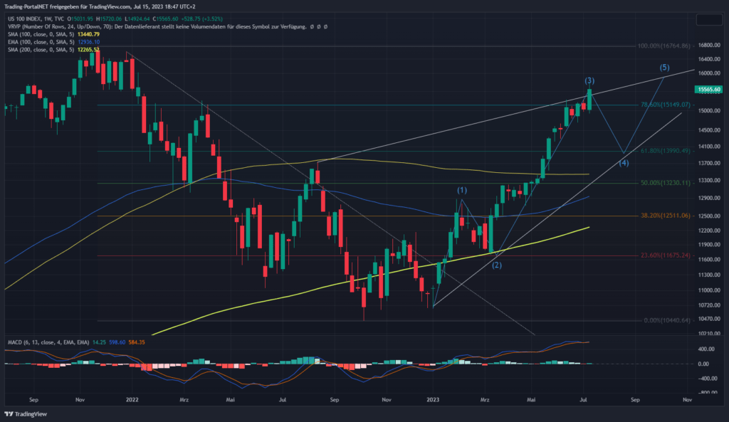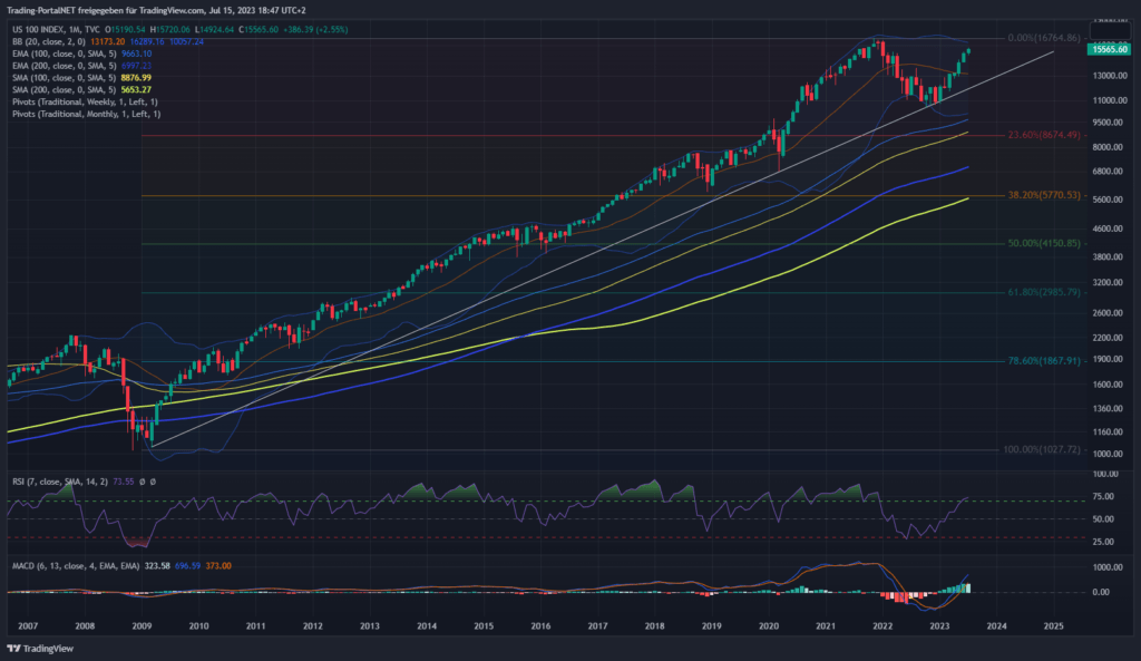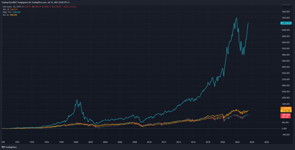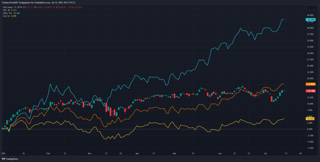 Wir beginnen die Chartreihe mit einem Performancevergleich zwischen Nasdaq100 (blau), S&P500 (gelb), Dow Jones (lila) und DAX seit Jahresbeginn 2023. DAX (+15,67%), S&P500 (+16,03%), Dow Jones (+4,11%) und Nasdaq100 (+42,28%).