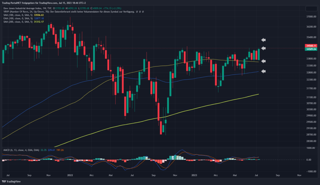 Der Dow Jones bleibt als Underperformer im bullischen Muster, allerdings konnte das wichtige Juni-Hoch an der 34.6 weiterhin nicht herausnehmen werden. Unterhalb bleibt eine Doppelspitze als Gefahr möglich. Die 33.900 stellen eine erste relevante Zone. Die 34.400 stellen einen ersten relevanten Bereich. Oberhalb steht eine erste Spanne über die .520 zur 34.600. Darüber die weitere Aufhellung mit erstem Ziel bei .700. Bei Bruch Trendverbindung an der 34.8, steigend. Unterhalb stellt die 34.260 einen ersten Support. Darunter Eintrübung zur 34.110. Bei Bruch Test Aufwärtstrend 33.980. Übergeordnet wird es für die Bullen erst an der 33.1 gefährlich. In der zweiten Grafik ist der Dow Jones Wochenchart zu erkennen.