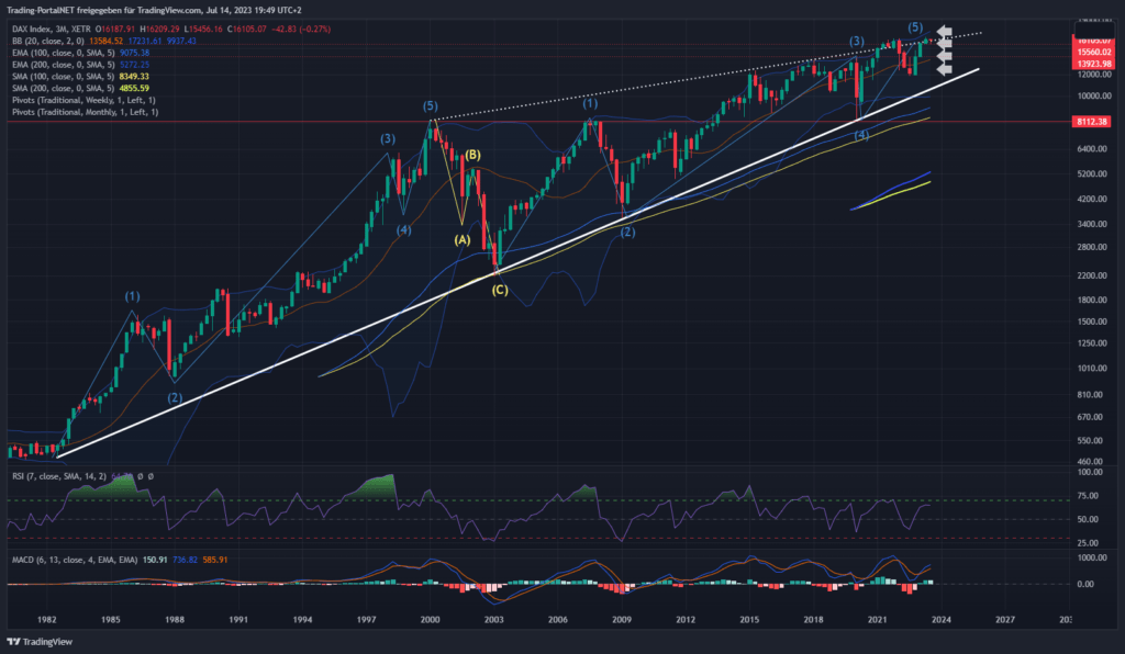 Der weitere Blick zum DAX Quartalschart (jede Kerze stellt ein Quartal dar) seit den 1980-er Jahren. Während Corona wurde der 40-jährige Aufwärtstrend getestet und verteidigt. Obere Begrenzungslinie und 2022-er Begrenzungslinie bremsen die DAX-Rally (von Oktober 2022) momentan aus.