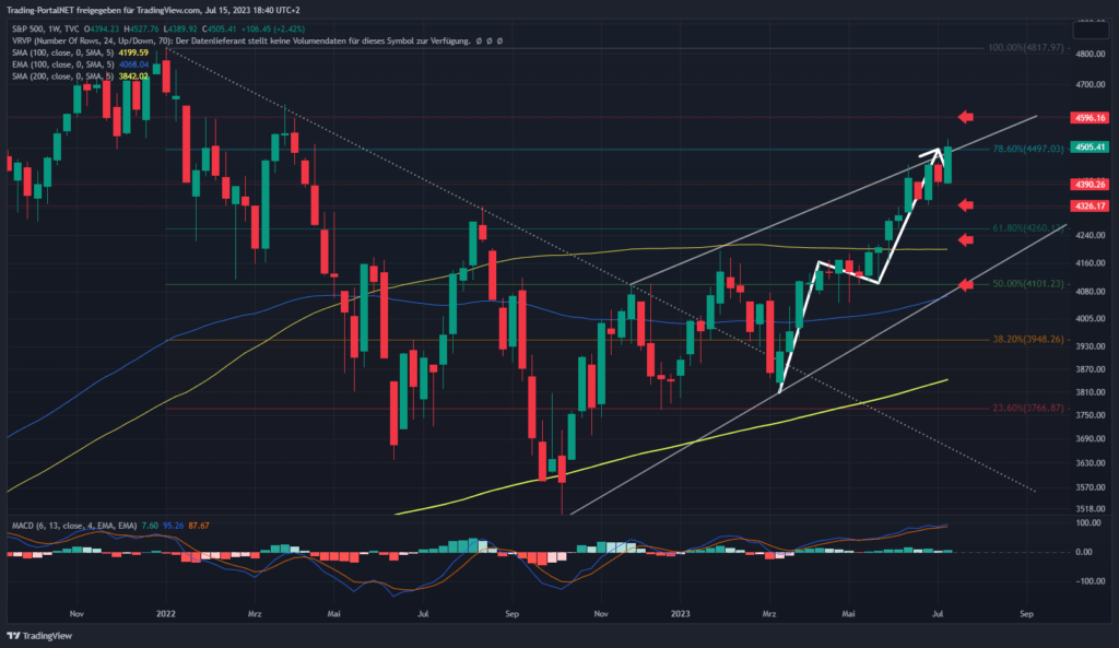 Ein kurzer Blick in den US-Markt (Komplette Updates für den US-Markt gibt es auf Trading-Portal.NET – Premium) ins übergeordnete Bild. Der S&P500 mit einer starken Woche bis ans 78,6-er Retracement der 2022-er Bewegung. An der 4.5 wird die nächste Richtungsentscheidung stattfinden. Die Bewegung seit Mai wäre reif für eine Konsolidierung, aber erst unterhalb besteht die Chance für den Auftakt. Die 4.500 stellen einen ersten relevanten Bereich. Oberhalb bleibt die Range über die .515 zur 4.528 aktiv. Darüber die weitere Bewegung zur 4.545. Bei Bruch 4.570. Unterhalb rückt hingegen die Gap-Zone 4.490 zur .470 in den Blickpunkt. Darunter weitere Bewegung zur 4.455 (1. Warnsignal für die Bullen) und anschließend .440.