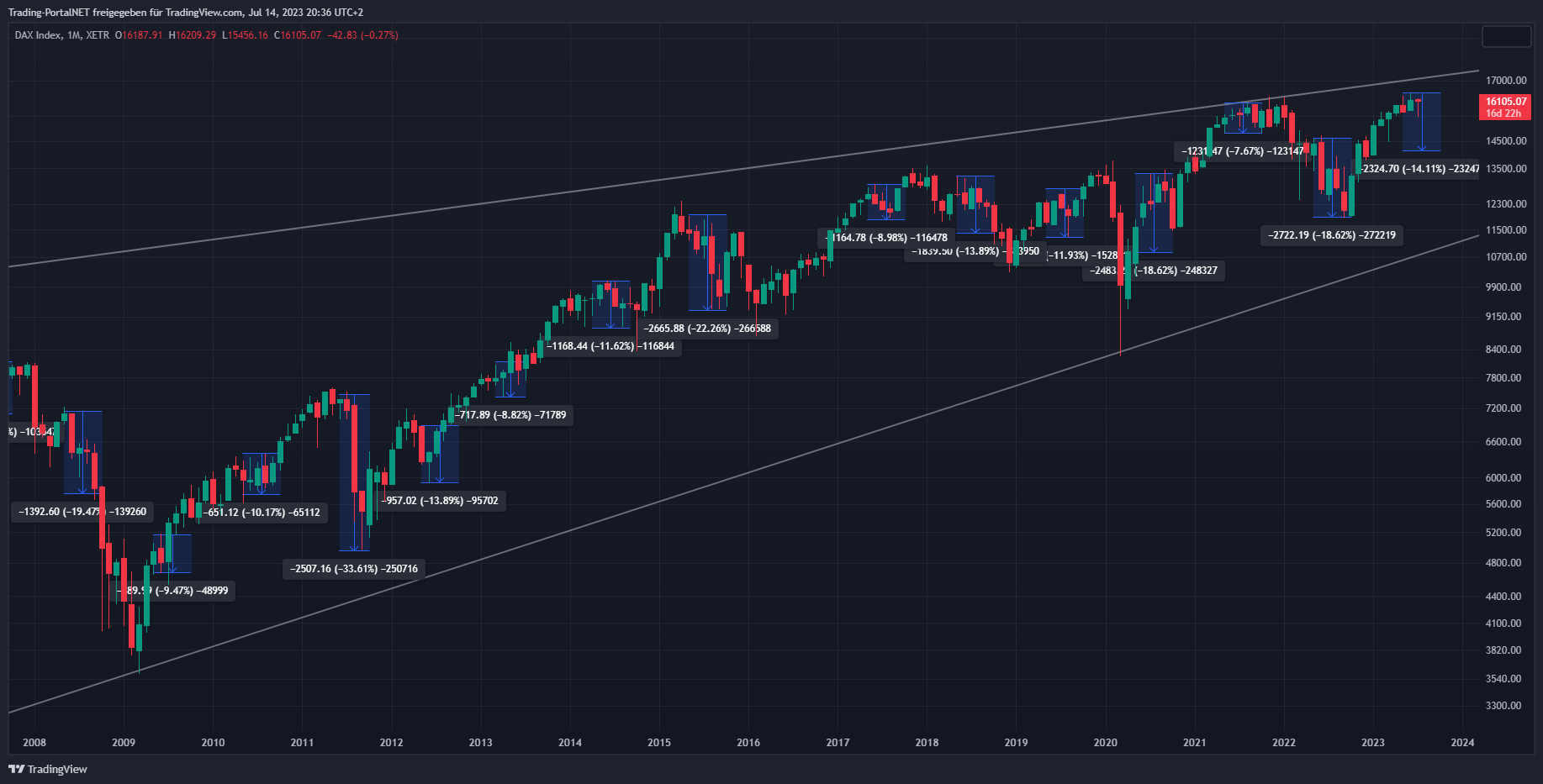 Nachfolgend auch die übergeordneten Bilder im Monatschart (1 Kerze = 1 Monat) und Jahreschart (1 Kerze = 1 Jahr).