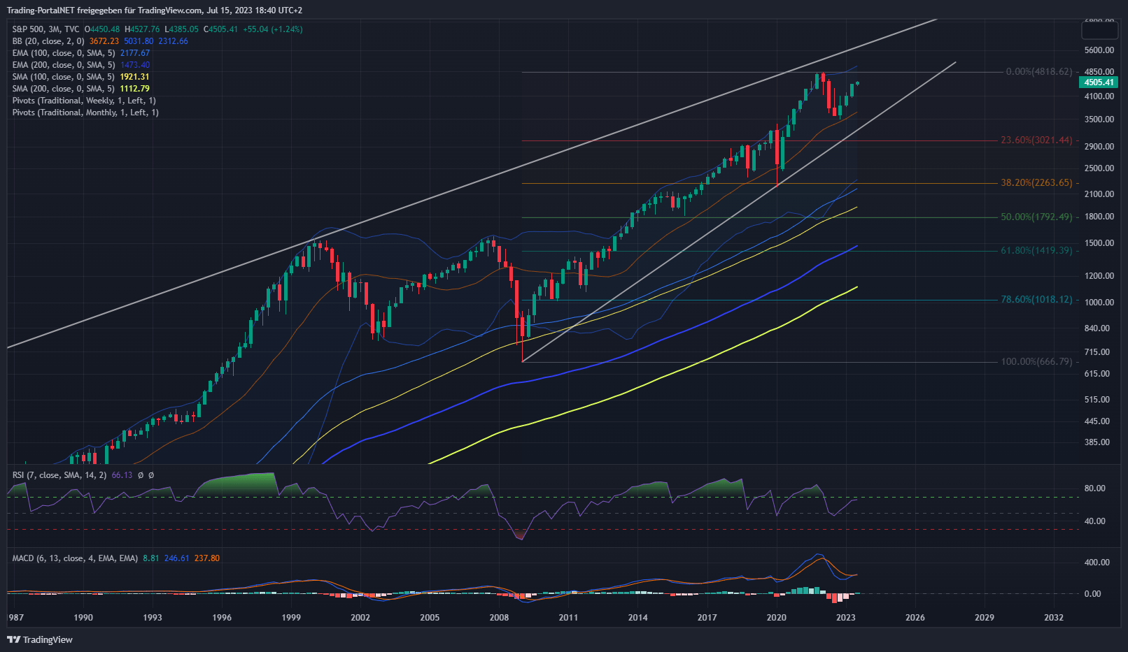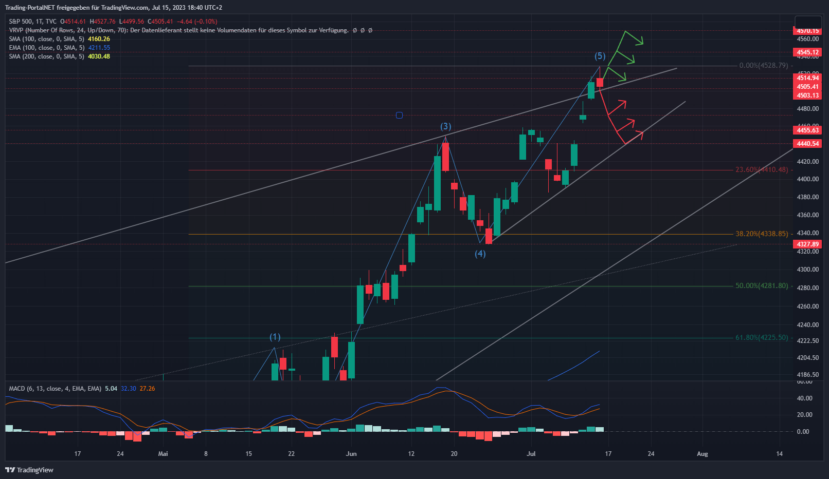 Ein kurzer Blick in den US-Markt (Komplette Updates für den US-Markt gibt es auf Trading-Portal.NET – Premium) ins übergeordnete Bild. Der S&P500 mit einer starken Woche bis ans 78,6-er Retracement der 2022-er Bewegung. An der 4.5 wird die nächste Richtungsentscheidung stattfinden. Die Bewegung seit Mai wäre reif für eine Konsolidierung, aber erst unterhalb besteht die Chance für den Auftakt. Die 4.500 stellen einen ersten relevanten Bereich. Oberhalb bleibt die Range über die .515 zur 4.528 aktiv. Darüber die weitere Bewegung zur 4.545. Bei Bruch 4.570. Unterhalb rückt hingegen die Gap-Zone 4.490 zur .470 in den Blickpunkt. Darunter weitere Bewegung zur 4.455 (1. Warnsignal für die Bullen) und anschließend .440.
