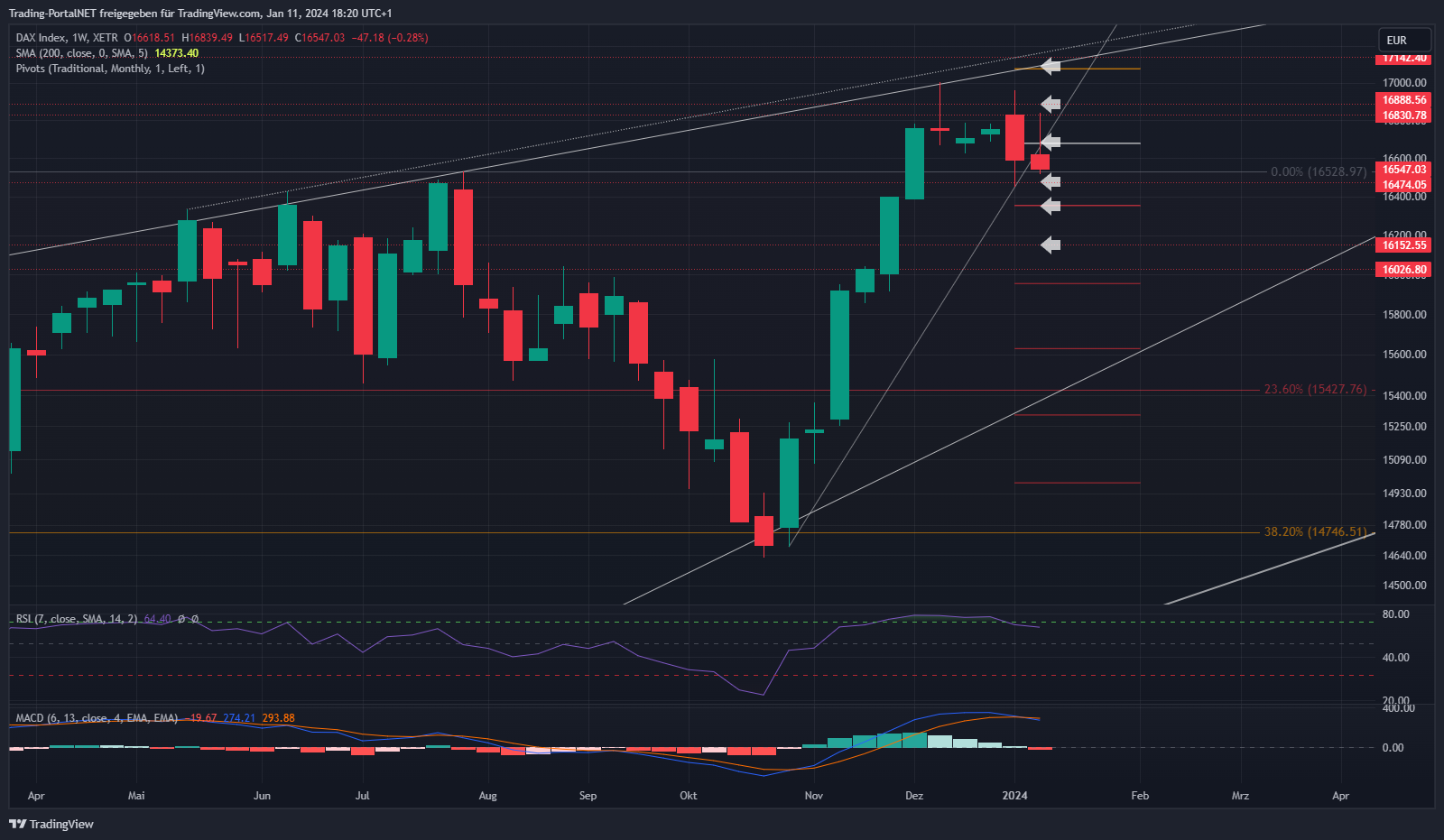 Der Blick zum Wochenchart, wo der DAX nach der starken Rallye Schwäche an der 17k zeigt. Top-Bildunggefahr. Eine Konsolidierung der Anstiegsbewegung dürfte bis unter die 16k führen. Die 16.660 stellen den ersten relevanten Bereich auf Wochensicht. Oberhalb bleibt die Range zur 16.830/.890 aktiv. Darüber der Türöffnet zur 17k und anschließend 17.070/17.1. Unterhalb wäre hingegen der erste Cluster zur 16.530/.470 zu nennen. Darunter die 16.350. Bei Bruch 16.150.