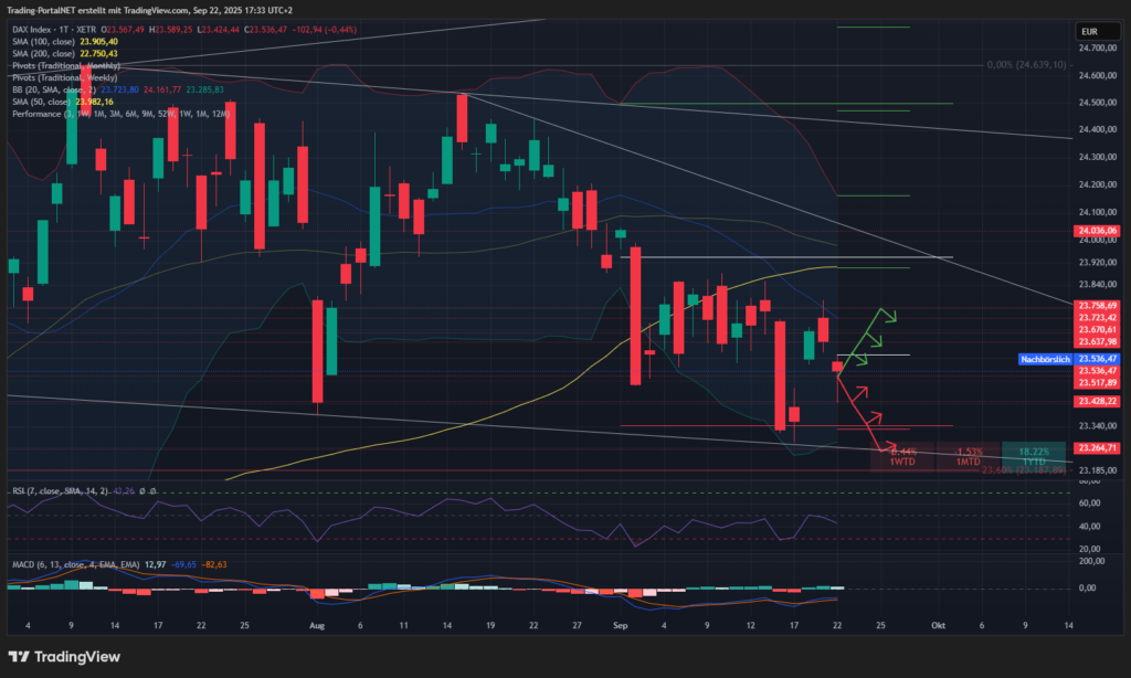 - Oberhalb bleibt der Cluster zur 23.590 aktiv. Darüber würden 23.640 und .670 folgen. Im Anschluss erneuter Kampf am m. Bollinger 23.720/.760. Bei Bruch Aufhellung zur 23.9.