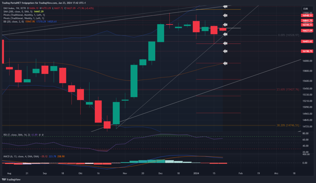 Der Blick zum Wochenchart, wo der DAX nach der starken Rallye weiter innerhalb einer Flagge konsolidiert. Die klarer Underperformance zur Wall Street kann als Warnsignal verstanden werden. Saubere Konsolidierungsziele nach der Novemberrallye dürften bis unter die 16k führen. Die 16.550 stellen den ersten relevanten Bereich auf Wochensicht. Oberhalb bleibt die Range zur 16.680 und .750 aktiv. Darüber der Türöffner zur 16.830 und .950. Anschließend 17.070/17.140. Unterhalb wäre hingegen der erste Cluster zur 16.350 zu nennen. Darunter dürfte die Konsolidierung zur 16.2 fortgesetzt werden. Bei Bruch 15.950 (m. Bollinger).