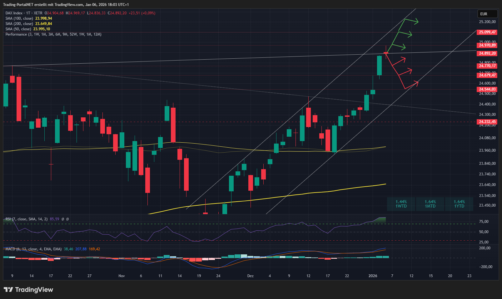 Die Märkte bleiben auch am Dienstag in positiver Grundstimmung. Der DAX erreichte bei 24.969,17 Punkten ein neues Allzeithoch und hat damit sein Broadening-Top rechnerisch vollständig durchlaufen. Zum Handelsschluss entfernte sich der Index jedoch wieder vom Rekordniveau.