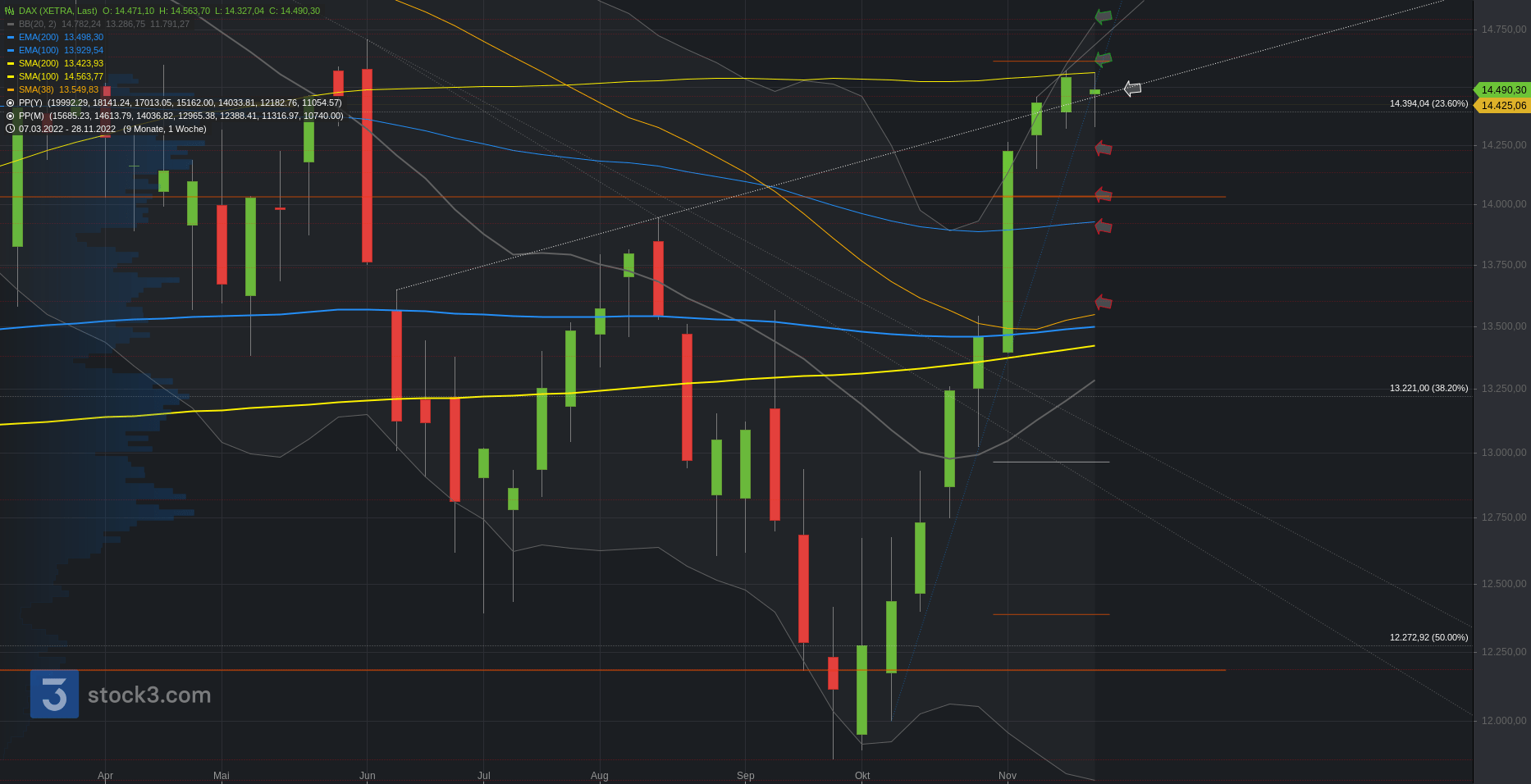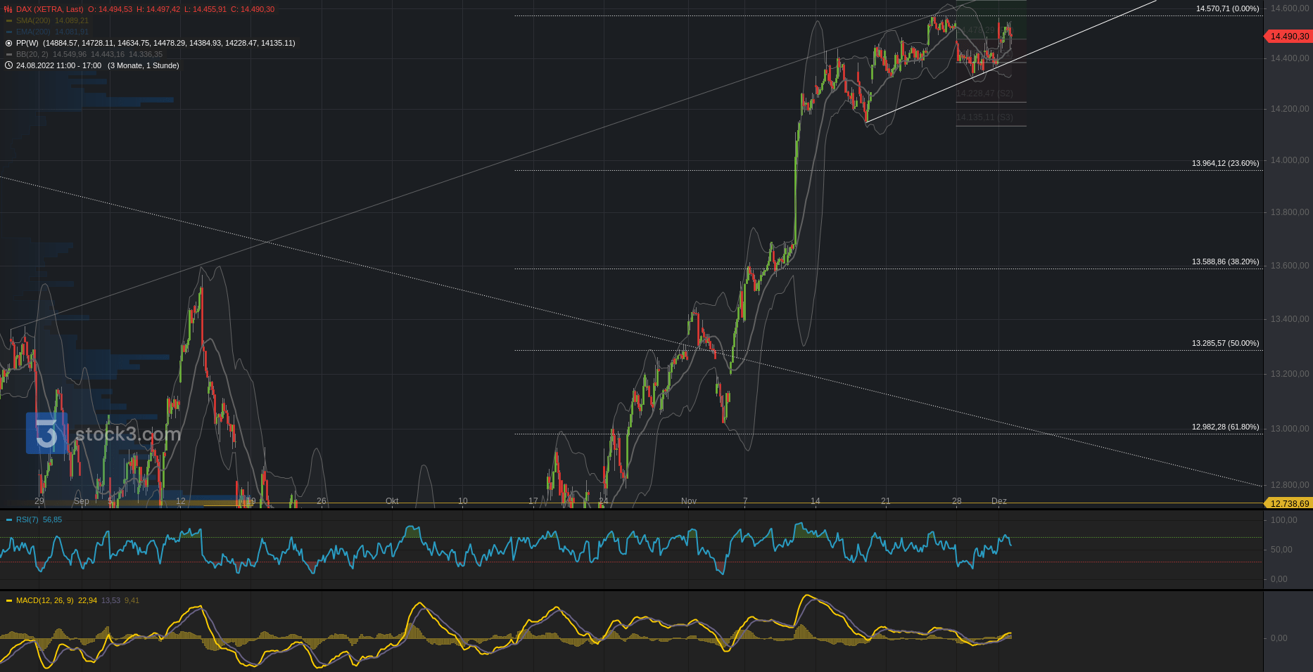 Der Blick zum Wochenchart, wo der DAX als Outperformer acht Wochen in Folge mit einer Perfomance von +23% ansteigen konnte. Die 14.460 stellen im Wochenchart einen ersten relevanten Bereich.