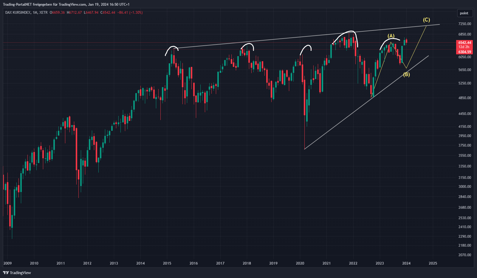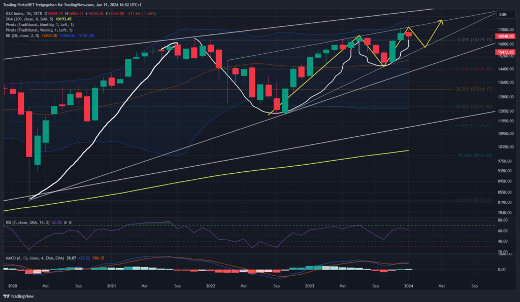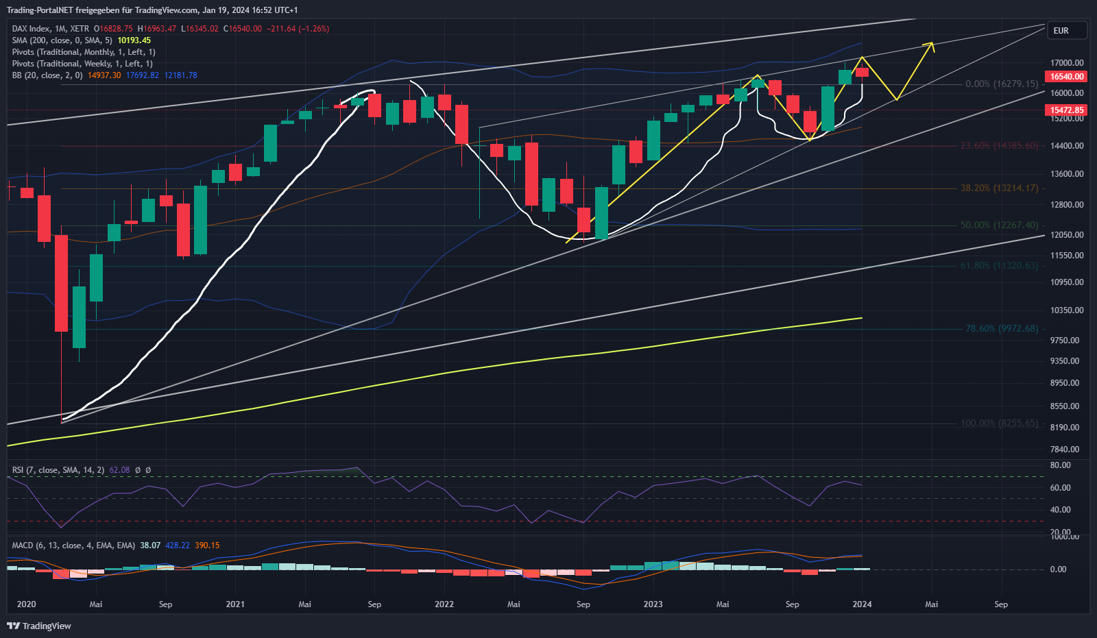 Der Blick zum DAX Monatschart. Zu sehen der Corona-Crash und die nachfolgende Rallye, welche 2022 bullisch konsolidiert und ab Oktober 2022 bullisch aufgelöst wurde. 2023 hat sich zudem eine Cup & Handle ausgebildet, die eine gute bullische Grundlage für 2024 darstellt. Oberhalb der 17.2 würden sich direkt weitere Zugewinne anbieten. Unterhalb muss ein Zwischenschritt eingeplant werden. 16.6 – 16k – 15.6 wäre ein gesundes Verlaufsmuster.