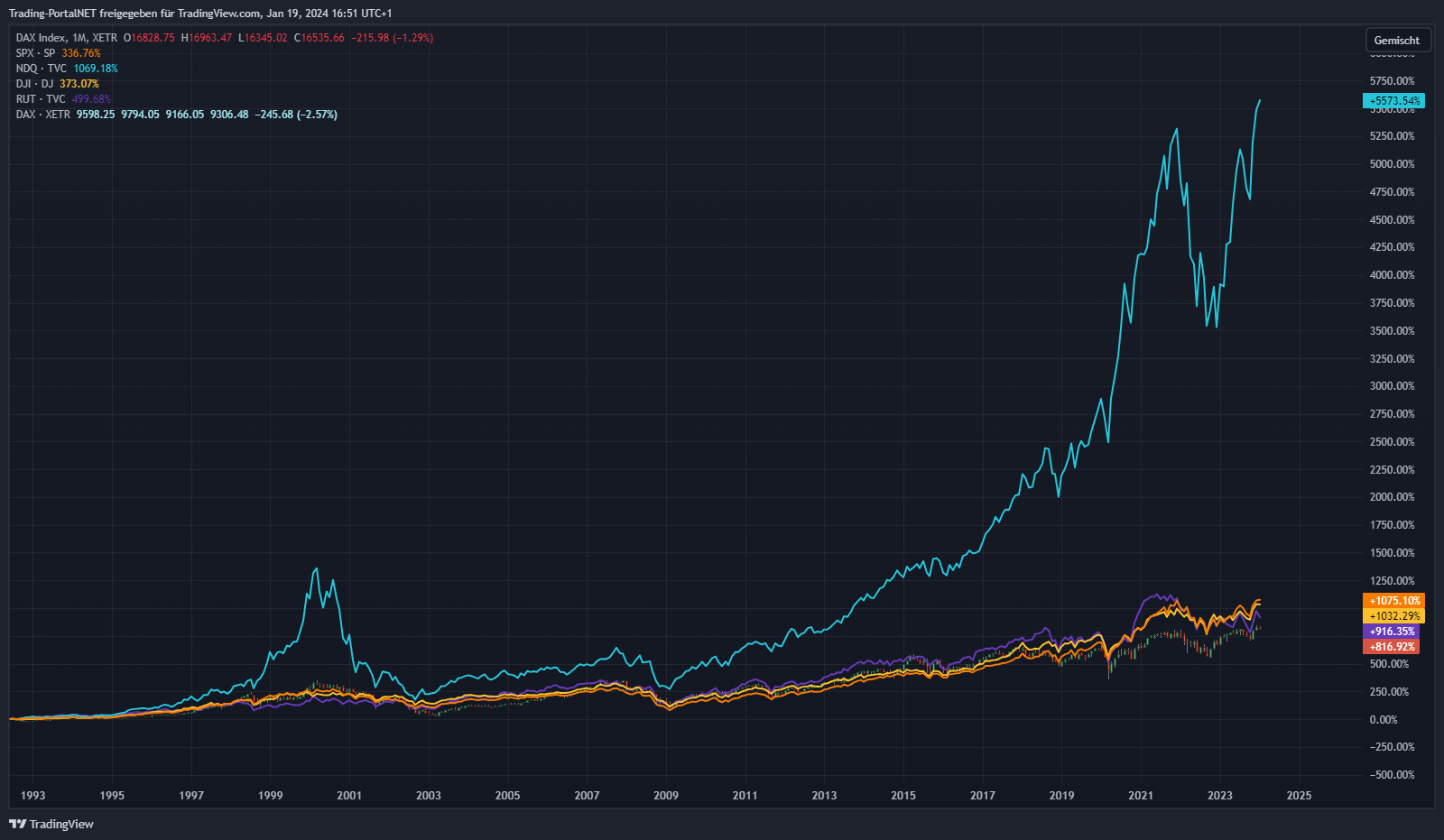 Wir beginnen die Chartreihe mit einem Performancevergleich zwischen Nasdaq100 (blau), S&P500 (gelb), Dow Jones (lila) und DAX seit Jahresbeginn 2024. DAX (-1,2%), S&P500 (+1,3%), Dow Jones (+0,4%) und Nasdaq100 (+2,8%).