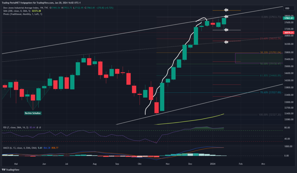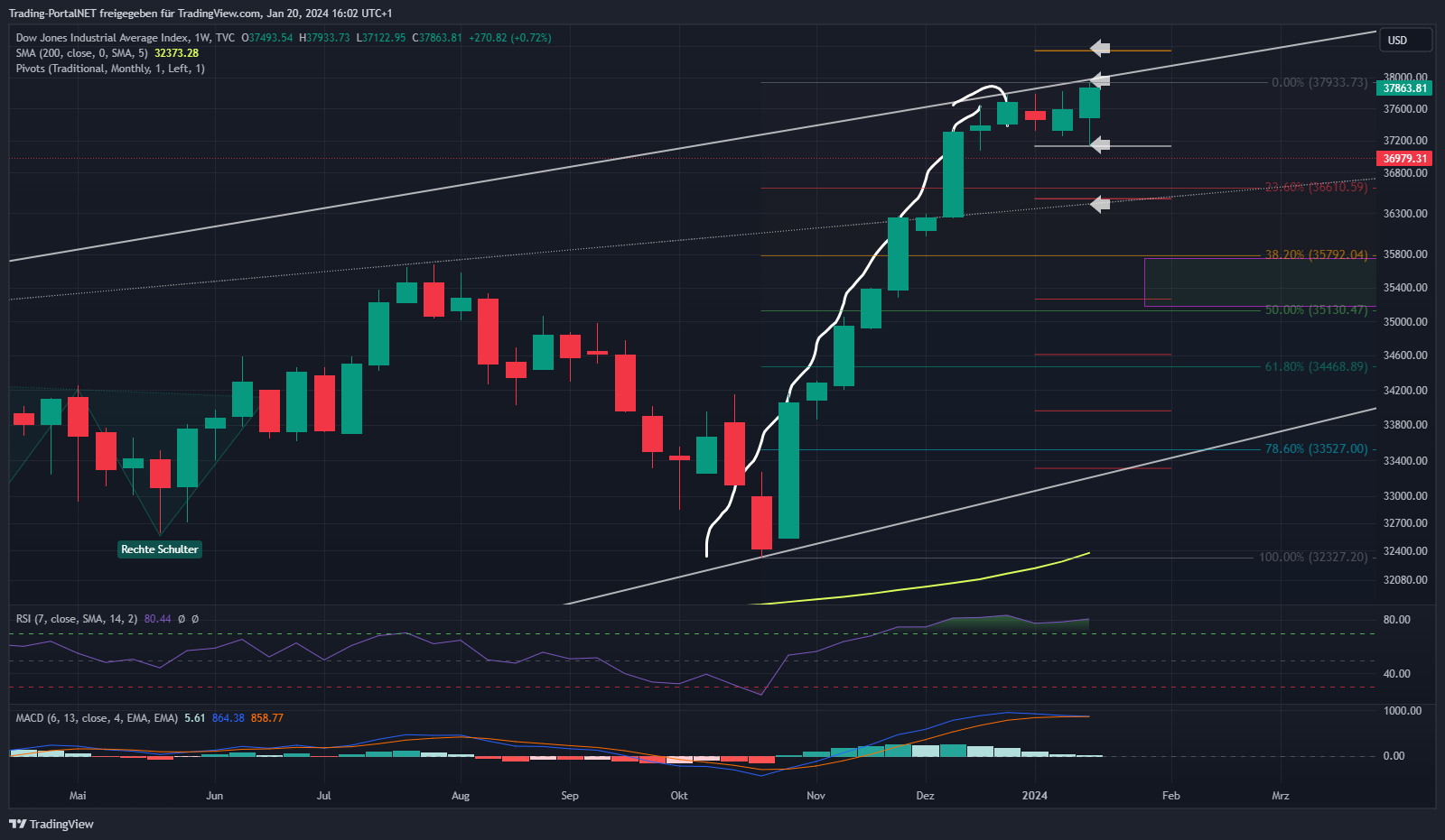 Der Dow Jones ebenso mit 11 Gewinnwochen in den letzten 12 Handelswochen. Die letzten 4 Wochen jedoch nur mit einer leicht ansteigenden Seitwärtsbewegung, welche ebenso schon Bestandteil einer Top-Bildung sein kann. Der gesehene Impuls erinnert sehr an die Impulsbewegung von exakt vor einem Jahr (Oktober – Dezember). iSKS-Ziel erreicht. Bei Top-Bildung muss eine Konsolidierung zur 35.5/35k eingeplant werden. Zwischenziele 37k/36.4. Oberhalb der 38k rückt hingegen die 38.3 in den Fokus.