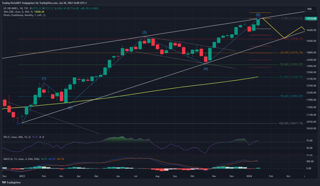 In der vergangenen Handelswoche konnten die Aktienmärkte ihre Monatsverluste komplett ausmerzen (Ausnahme DAX), wobei an der Wall Street sogar neue Allzeithochs erreicht werden konnten. Besonders erwähnenswert ist zudem die Vollendung der sogenannten „fünften Welle“ (Elliott-Wellen) durch den Nasdaq, was darauf hindeutet, dass der Index nun bereit für eine Konsolidierungsphase der seit November anhaltenden Aufwärtsbewegung sein könnte. Im Gegensatz dazu zeigt der DAX weiterhin eine Underperformance und konnte nicht im gleichen Maße von der Dynamik an der Wall Street profitieren. Diese relative Schwäche des DAX könnte auf spezifische Herausforderungen oder Unsicherheiten in der deutschen und europäischen Wirtschaft hinweisen.