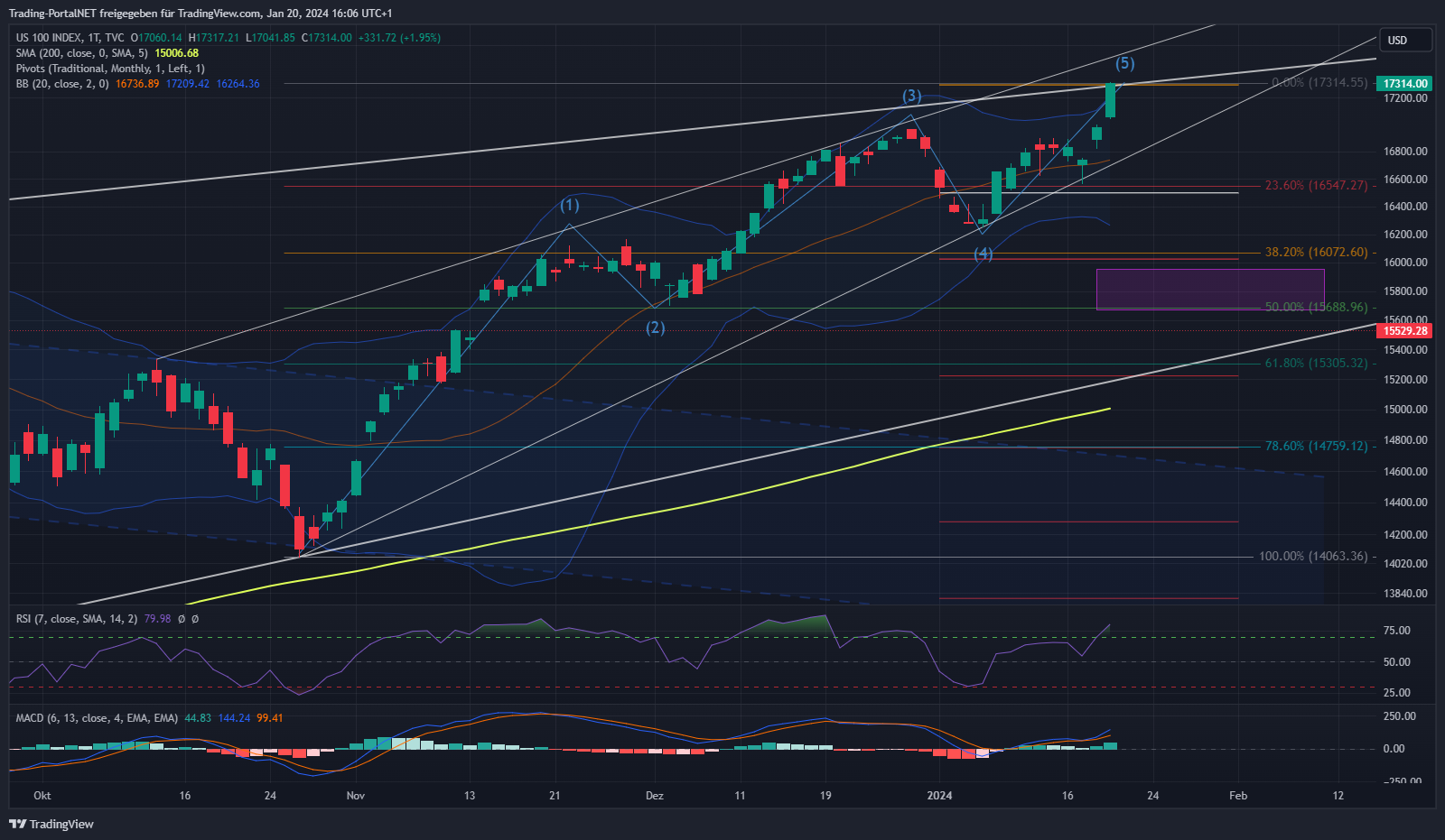 Der Nasdaq100 steht nach +23% seit November vor dem Abschluss einen großen Impulsbewegung. Der Abschluss der 5. Welle würde die Tür für eine mehrwöchige Konsolidierung öffnen. Oberhalb der 16.5 bleibt die Range zur 17.3 noch bestehen. Darüber 17.6. Unterhalb dürfte die Konsolidierung zur 16.250 und 16k begonnen werden. Bei Bruch rückt die Gap-Zone 15.7/15.5 in den Fokus, wo größere Gegenwehr wahrscheinlich wird.