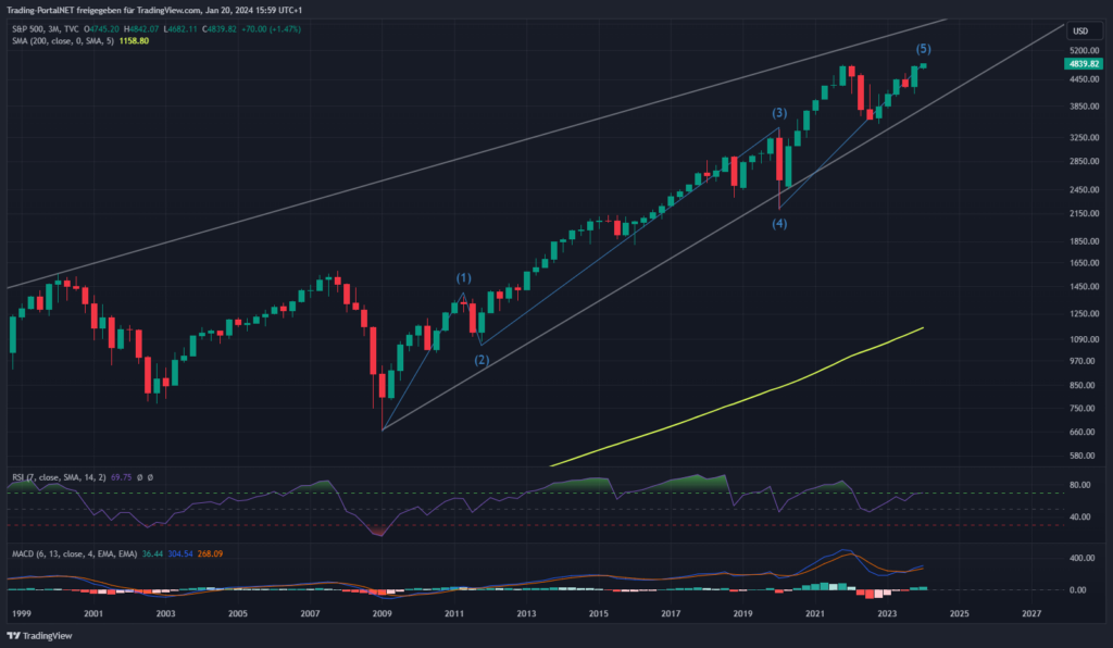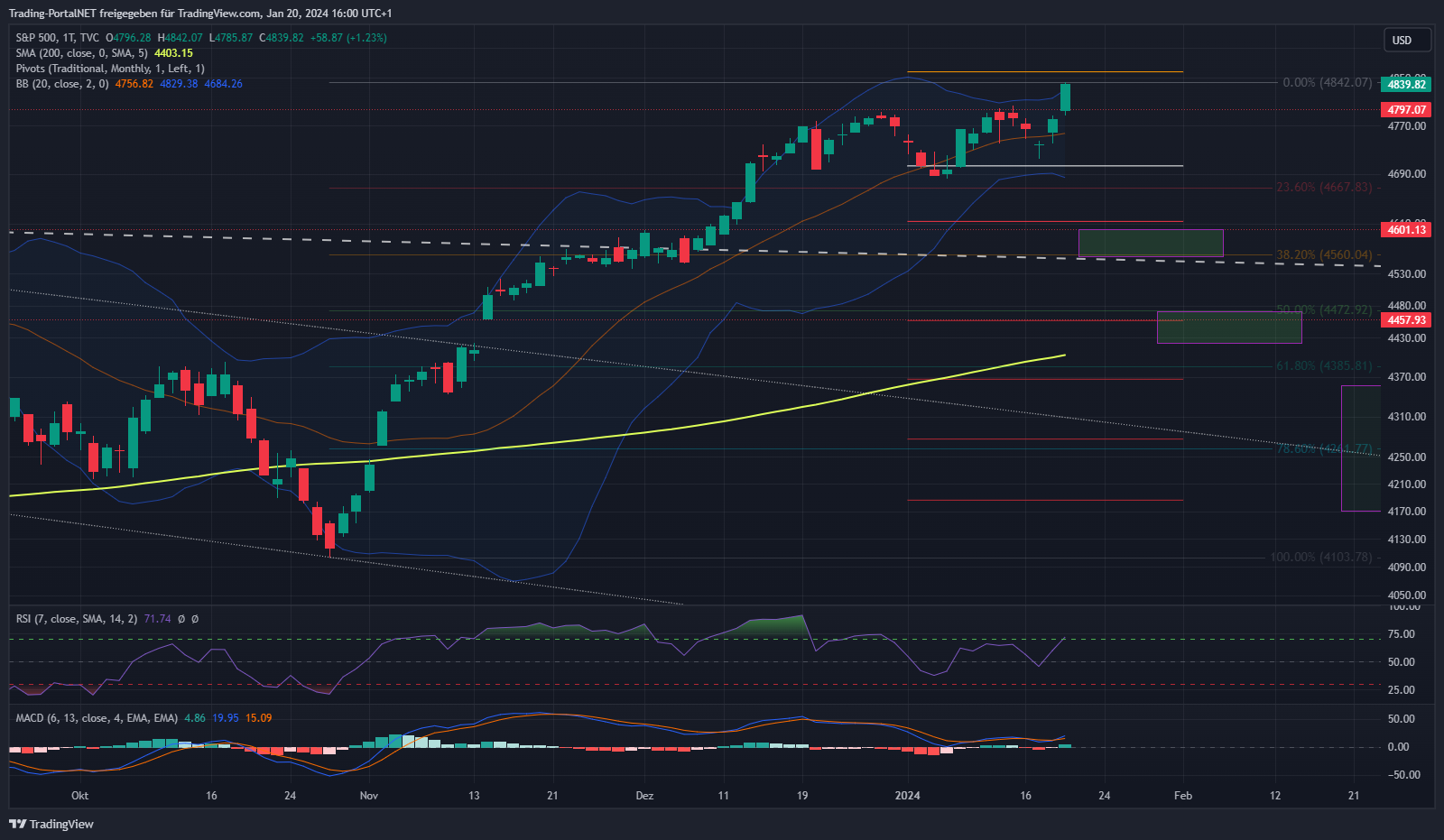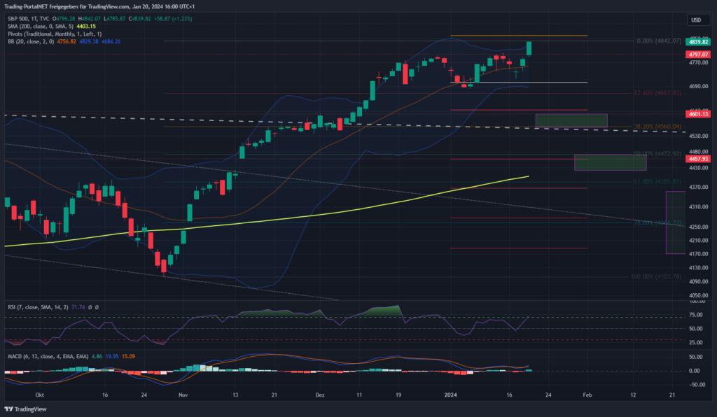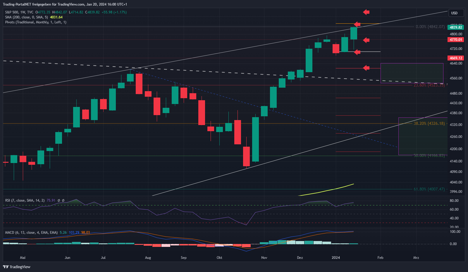 Ein kurzer Blick in den US-Markt (Komplette Updates für den US-Markt gibt es auf Trading-Portal.NET – Premium) ins übergeordnete Bild. Der S&P500 nach der Rallye seit November 2023 mit einer flachen Seitwärtsbewegung und einem knappen neuen Allzeithoch, welches wahrscheinlich schon zur Top-Bildung gehört. Oberhalb der 4.7 bleibt die Range zur 4.8 und dem AZH aktiv. Darüber wird eine weitere Bewegung zur 4.860 und anschließend 4.9 wahrscheinlich. Unterhalb droht hingegen der Weg in die Konsolidierung mit ersten Zielen um 4.680/4.6/4.550. Den detaillierten Ausblick gibt es im Dashboard tagtäglich aktuell.