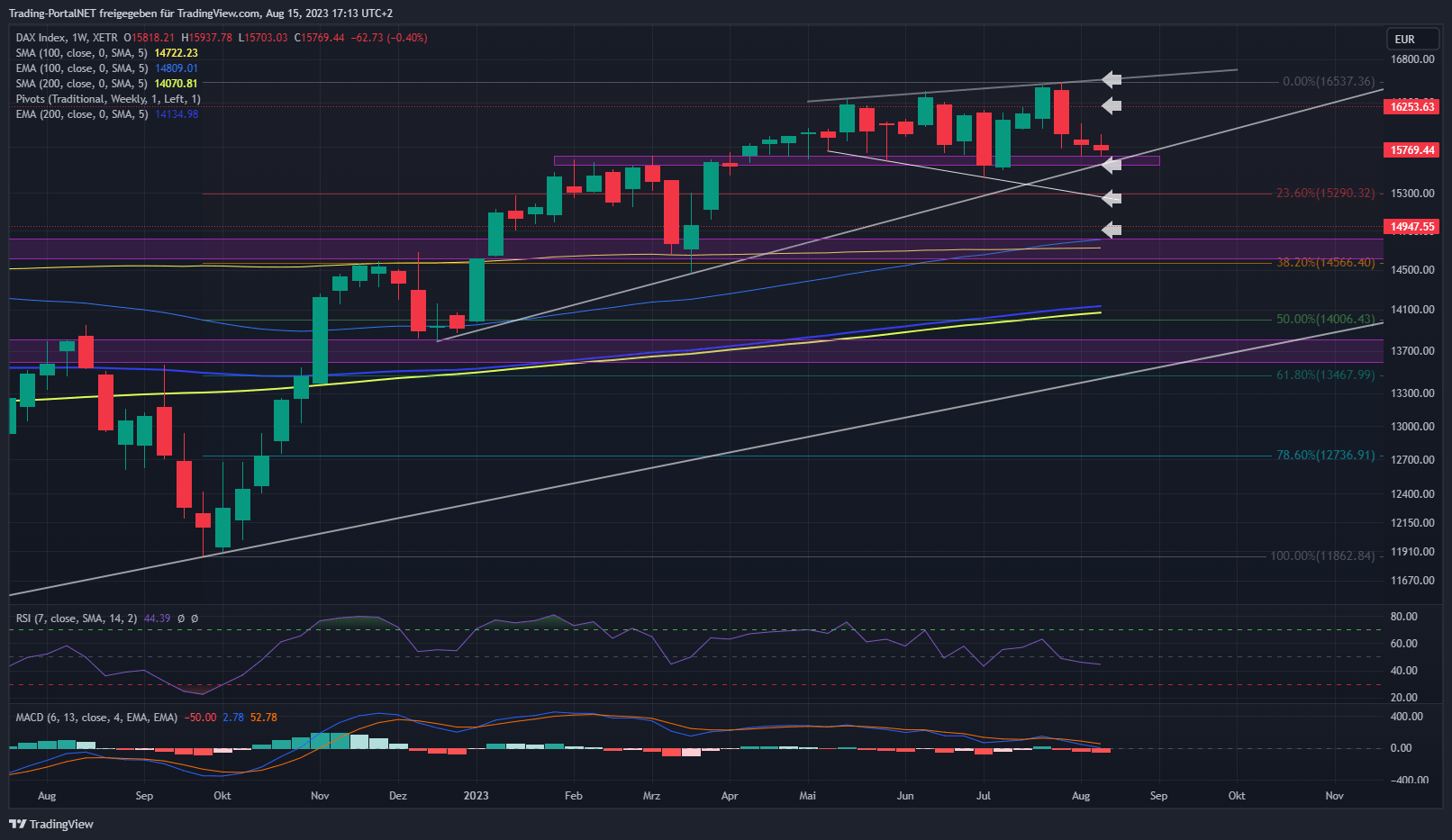 Der Blick zum Wochenchart, wo der DAX weiter im Seitwärtstrend tendiert. Ein Broadening-Top ist erkennbar und bringt auf der Unterseite noch Ziele um 15.6 und möglicherweise auch 15.3 mit. Viel tiefer darf der DAX nicht fallen, da ansonsten eine größere Korrektur tief in den 14k-Bereich wahrscheinlich wird. Ein Rücklauf in den Bereich 16.3 bringt hingegen wieder das Allzeithoch als wahrscheinliches Szenario auf den Plan.