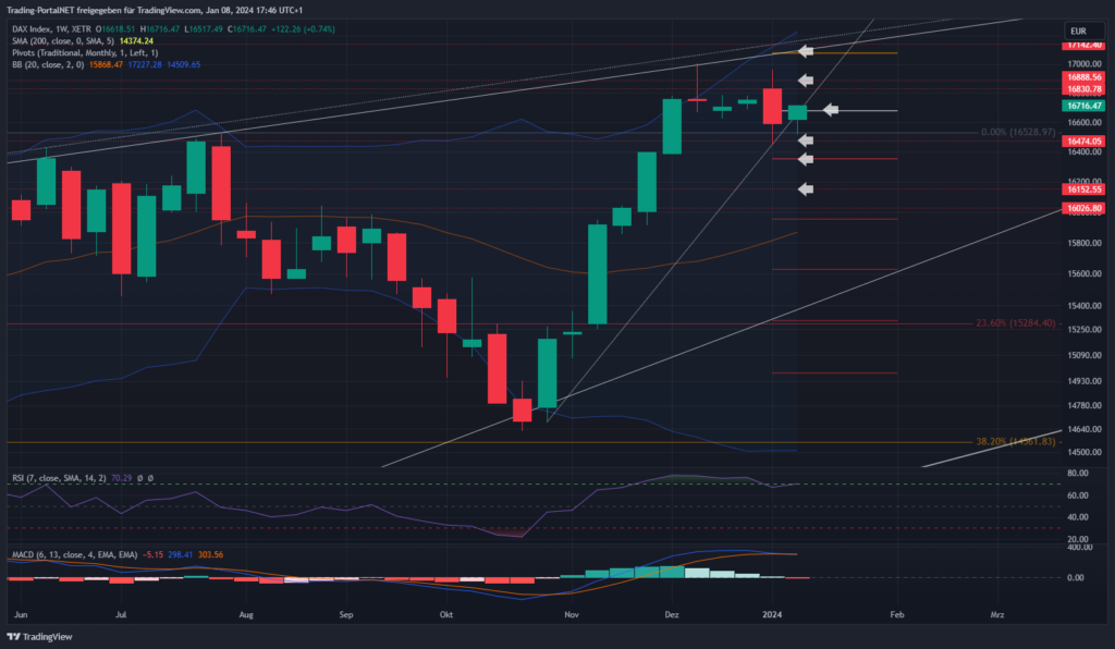 Der Blick zum Wochenchart, wo der DAX nach der starken Rallye Schwäche an der 17k zeigt. Top-Bildunggefahr. Eine Konsolidierung der Anstiegsbewegung dürfte bis unter die 16k führen. Die 16.660 stellen den ersten relevanten Bereich auf Wochensicht. Oberhalb bleibt die Range zur 16.830/.890 aktiv. Darüber der Türöffnet zur 17k und anschließend 17.070/17.1. Unterhalb wäre hingegen der erste Cluster zur 16.530/.470 zu nennen. Darunter die 16.350. Bei Bruch 16.150.