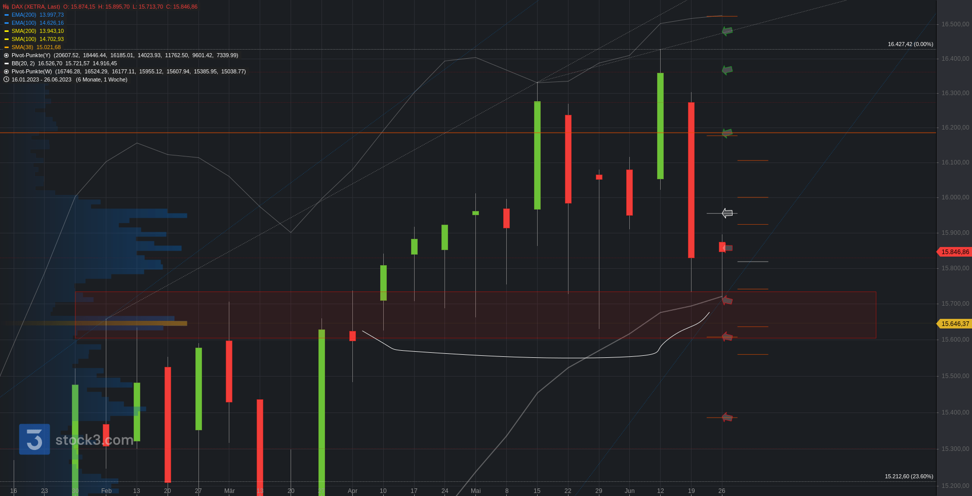 Unterhalb stellen hingegen die 15.830 einen ersten Cluster. Darunter folgen die 15.700 (m. Bollinger) und mit der 15.600 die große Supportzone. Bei Bruch Eintrübung zur 15.385.