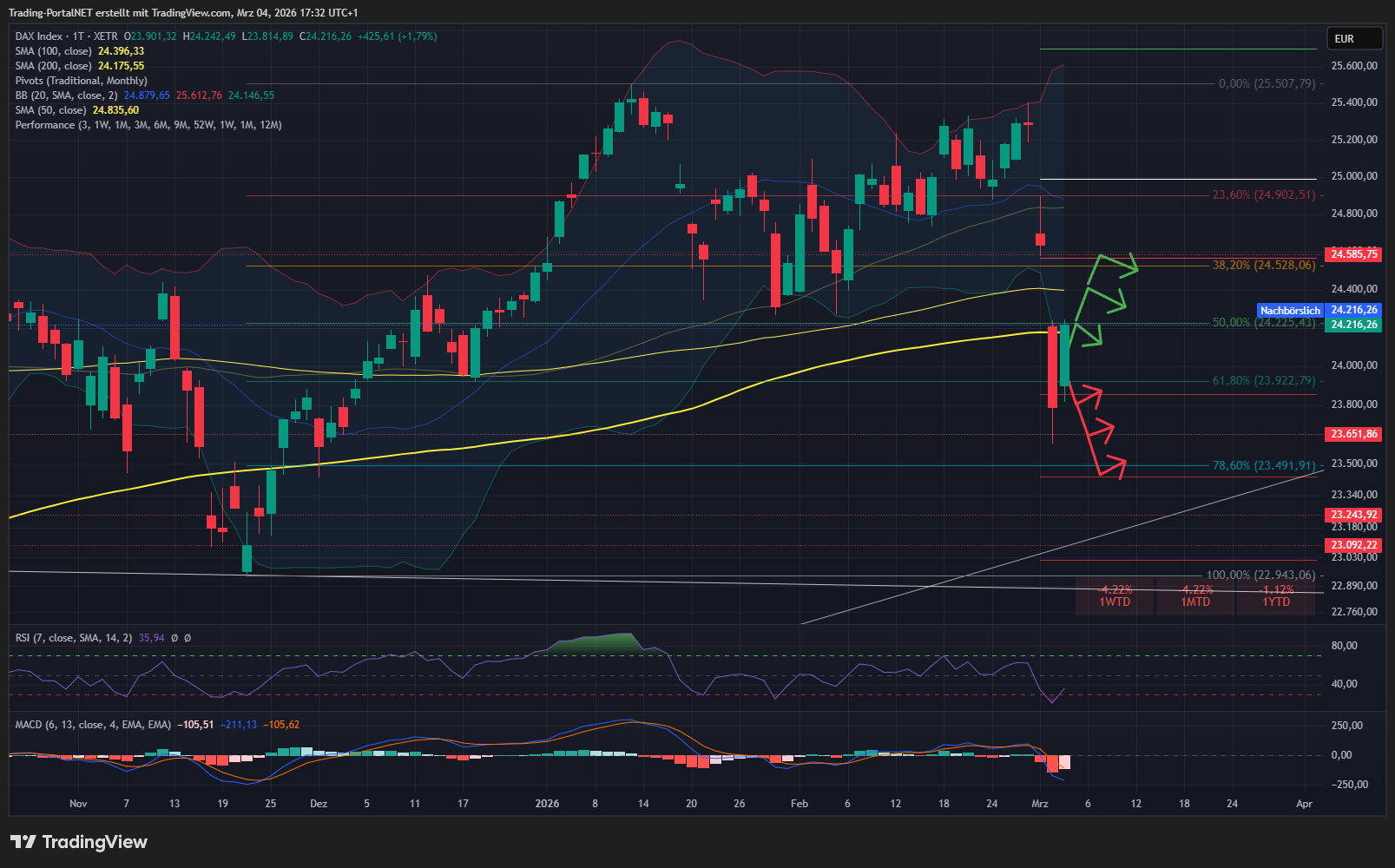 - Oberhalb >> 24.100 > 24.180/.230 (Kombiwiderstand mit 200-TL) >> 24.380 (100-TL) – 24.440 >> 24.530/.570 (Gap-Zone)