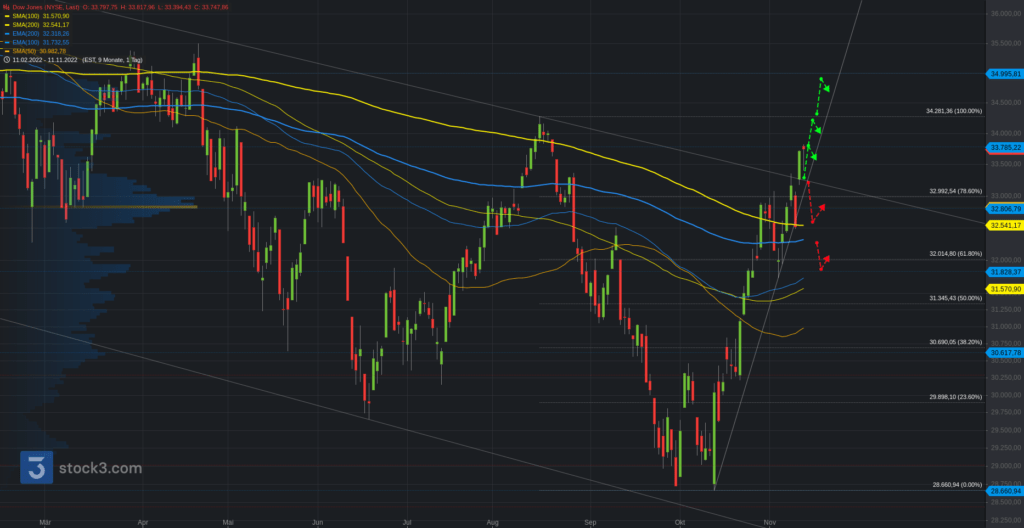 Der Blick zum Dow Jones, wo der Index seit Oktober +18% zulegen konnte. Der Abwärtstrend bei 33.250 konnte auf Wochenschluss überwunden werden, allerdings verlor der Dow seine Outperformance nach den Inflationsdaten. Oberhalb halten die Bullen eine Spanne zur 33.800. Darüber rücken 34.200/.280 in den Blick. Bei Bruch weitere Aufhellung Richtung 35k. Unterhalb stellen hingegen die 200-Tagelinien bei 32.540 und .320 eine nächste Unterstützung. Bei Bruch Eintrübung zur 31.800. In der zweiten Grafik ist das übergeordnete Bild im Dow Jones Quartalschart zu erkennen.