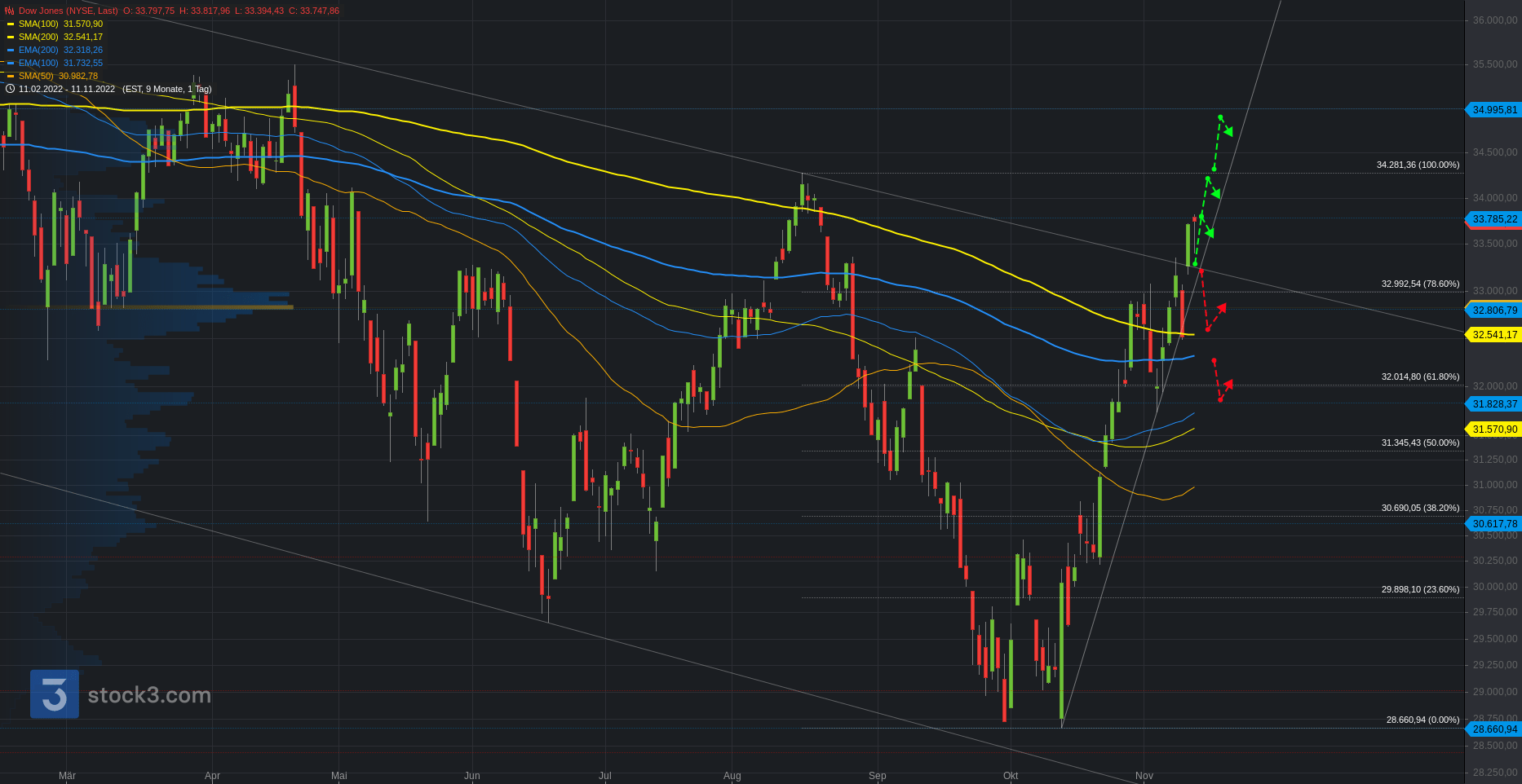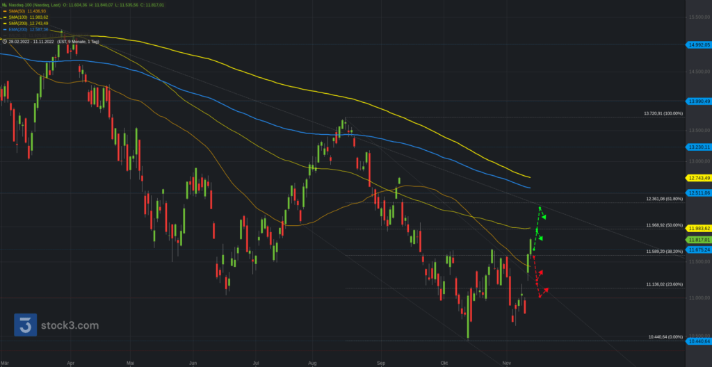 Der Nasdaq100 als diesjähriger Underperformer startete seine Bärenmarktrally erst mit den schwächeren Inflationsdaten. Oberhalb der 11.5/11.7 kann sie weiter Fahrt aufnehmen in Richtung 12k. Darüber weitere Aufhellung zur 12.350. Unterhalb wäre hingegen wieder die 11.2 im Fokus. Darunter Gap-Close an der 11k. Bei Bruch droht Test Jahrestief. Das Stagflations- und geldpolitische Szenario bleibt ein schwieriges Umfeld für „Growth“.