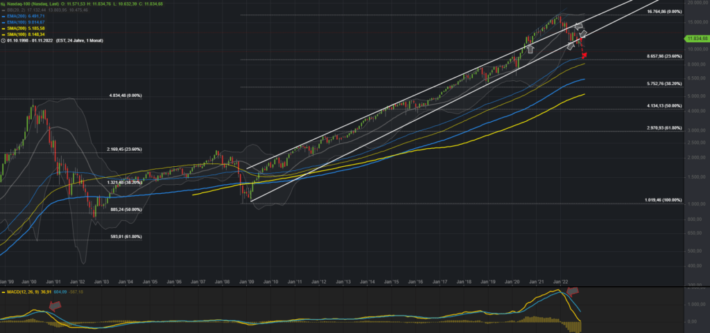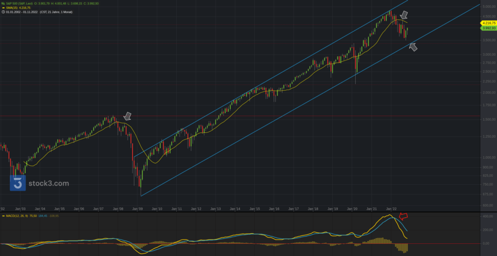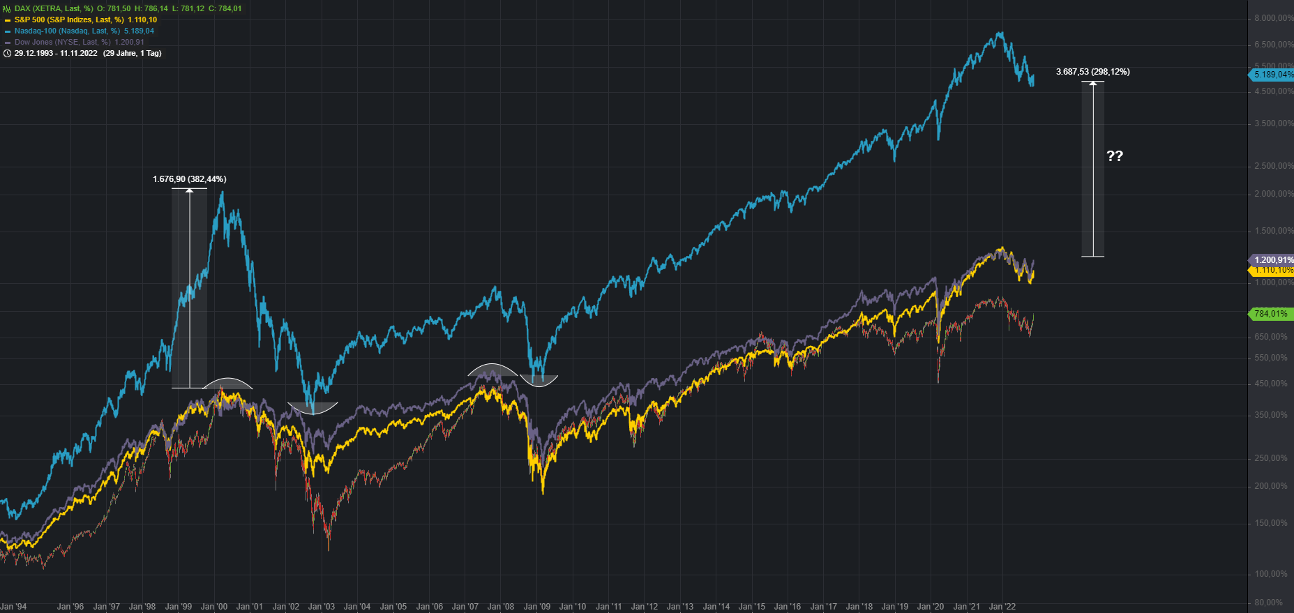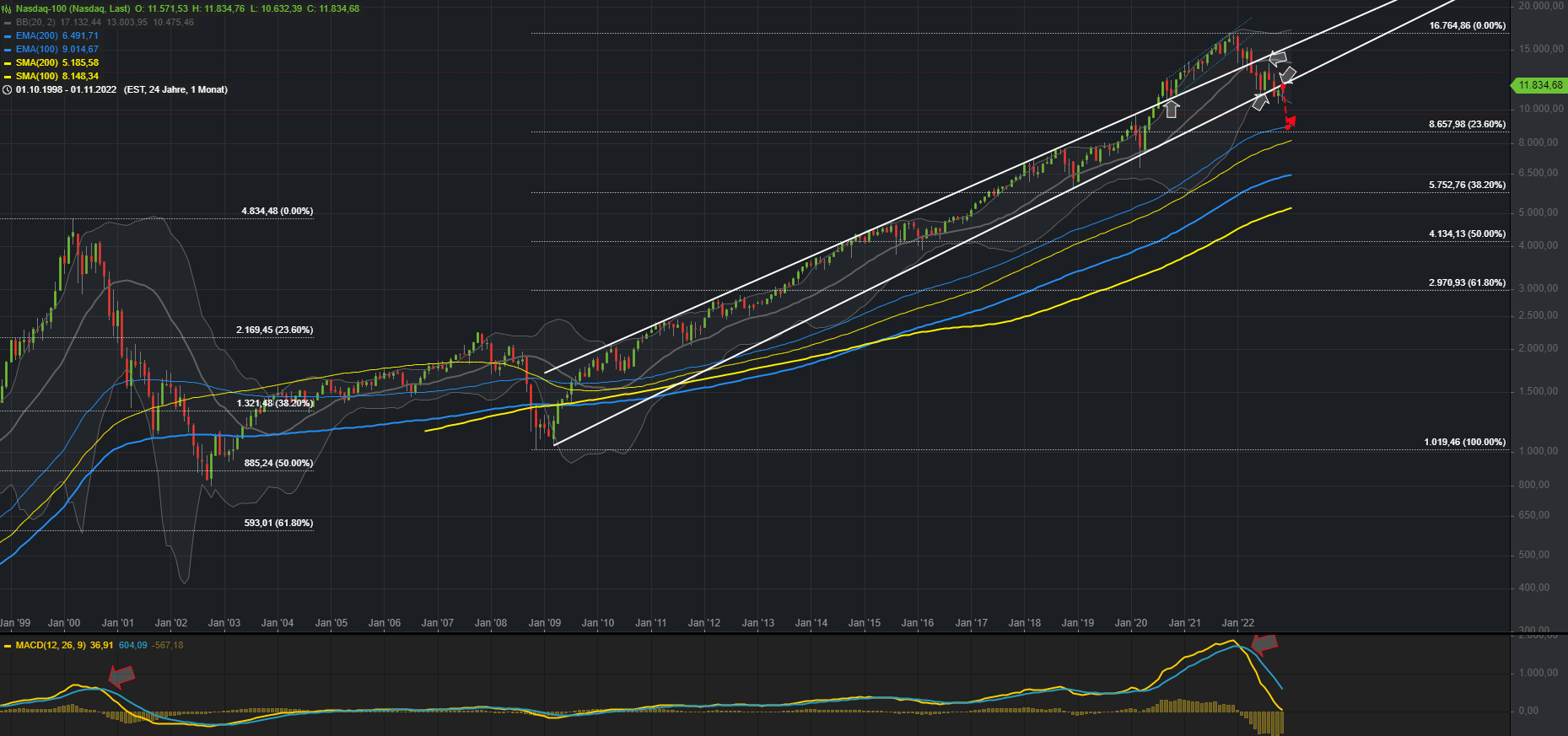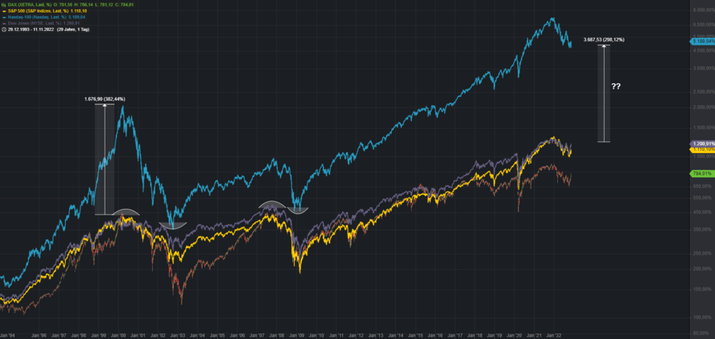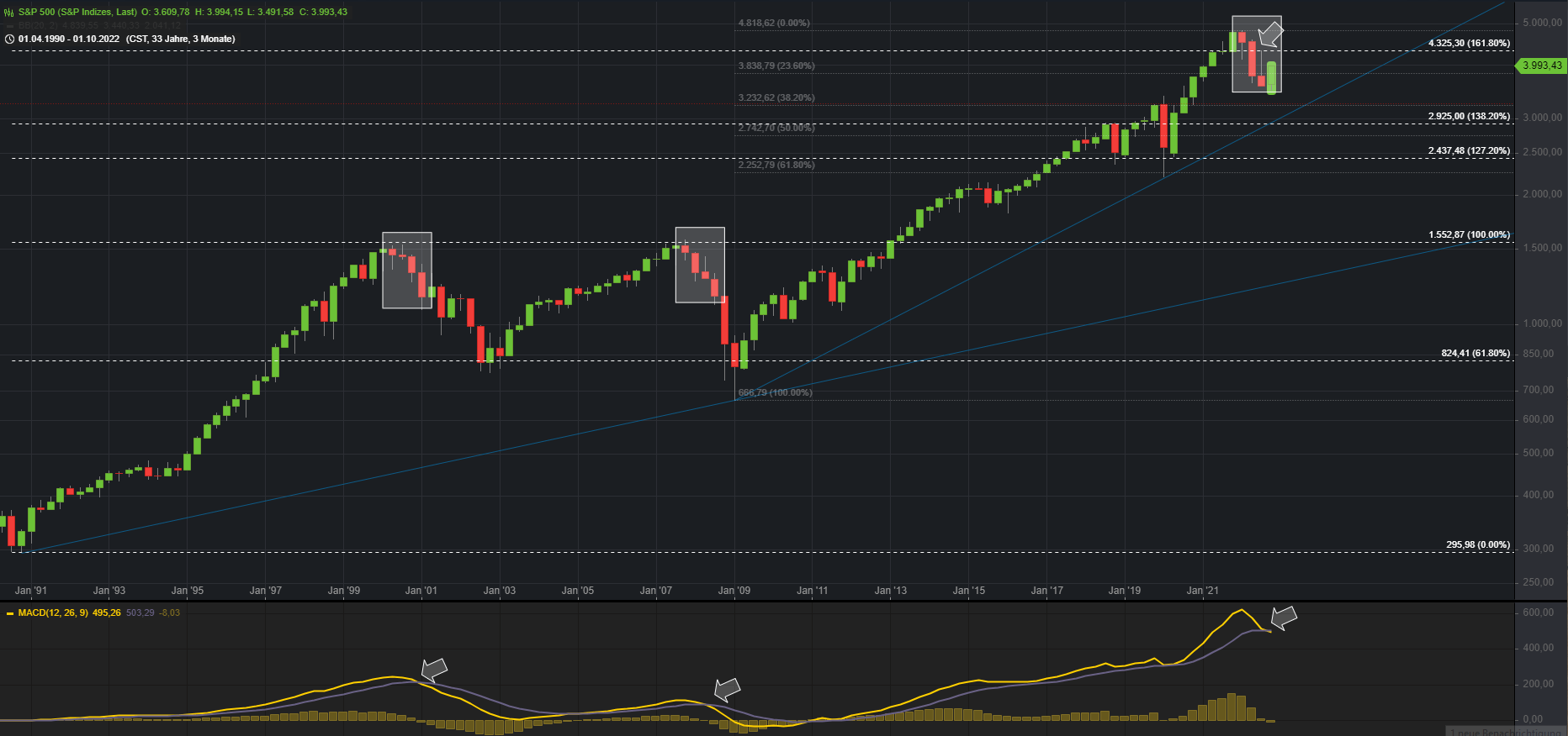 Unterhalb der 12.180 droht eine weitere Abverkaufswelle Richtung 11k. Oberhalb der 14k erste Stabilisierungstendenzen. Markiert sind im Chart auch die letzten beiden großen Bärenmärkte. Sehr auffällig ist hierbei der Faktor Zeit. Die vorangegangenen Rezessionen beschäftigten den Aktienmarkt viele Jahre, bis das Vorkrisenniveau wieder erreicht werden konnte.
