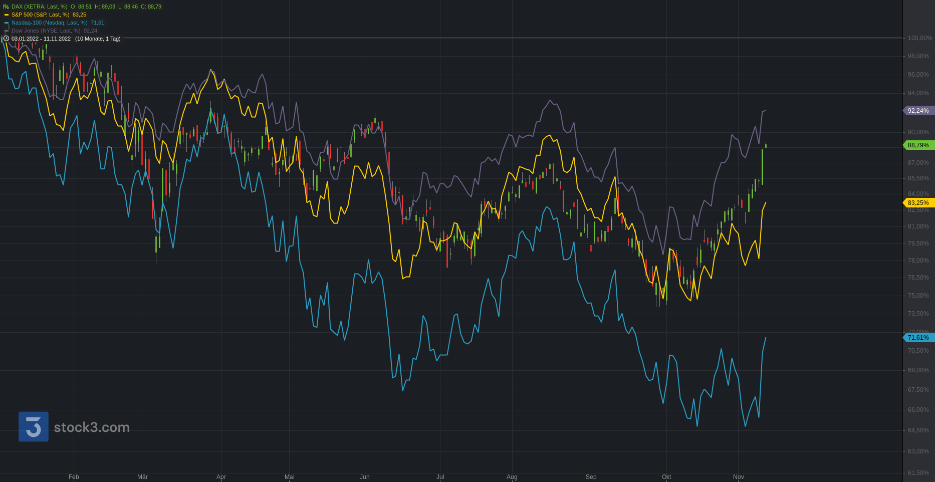 Wir beginnen die Chartreihe mit einem Performancevergleich zwischen Nasdaq100 (blau), S&P500 (gelb), Dow Jones (lila) und DAX seit Jahresbeginn. Vor allem Wachstumstitel Nasdaq100 (-27,59%) sind besonders stark unter Druck geraten. DAX (-10,45%), S&P500 (-16,22%) und Dow Jones (-7,13%) folgen mit etwas Abstand.