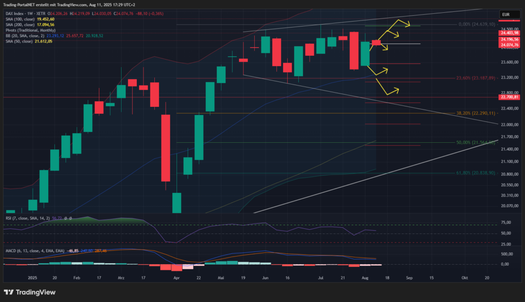 Der DAX startet schwächer, aber innerhalb seiner neutralen Range in die neue Woche. Bei Bruch durch die 24.4 könnte sogar nochmal ein knappes neues AZH in den Fokus rücken.