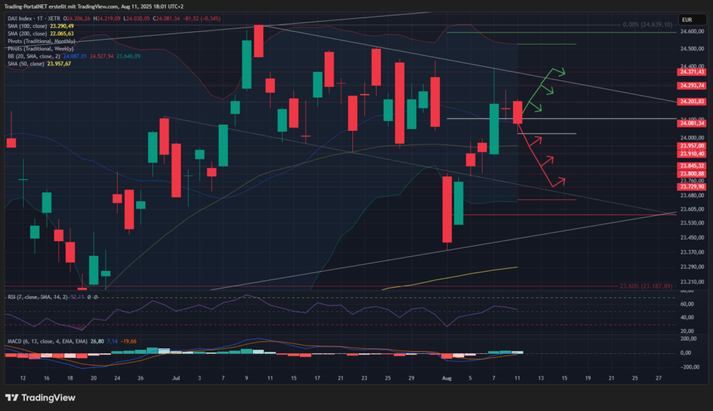 - Oberhalb bleibt der Cluster zur 24.185/.200 aktiv. Darüber Chance auf 24.290. Im Anschluss erneut der Weg zur Begrenzungslinie bei 24.350/.370.