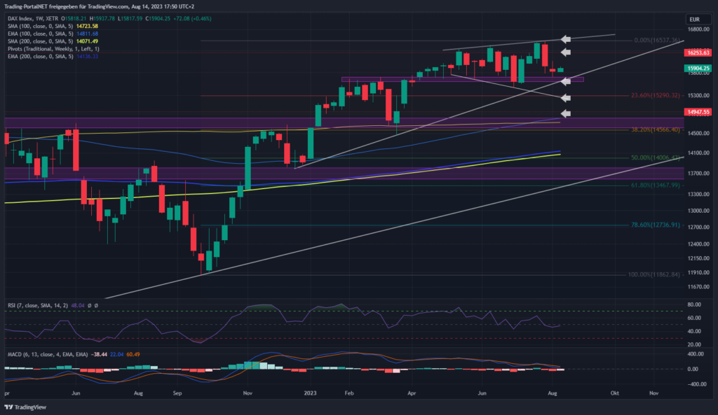 Der Blick zum Wochenchart, wo der DAX weiter im Seitwärtstrend tendiert. Ein Broadening-Top ist erkennbar und bringt auf der Unterseite noch Ziele um 15.6 und möglicherweise auch 15.3 mit. Viel tiefer darf der DAX nicht fallen, da ansonsten eine größere Korrektur tief in den 14k-Bereich wahrscheinlich wird. Ein Rücklauf in den Bereich 16.3 bringt hingegen wieder das Allzeithoch als wahrscheinliches Szenario auf den Plan.