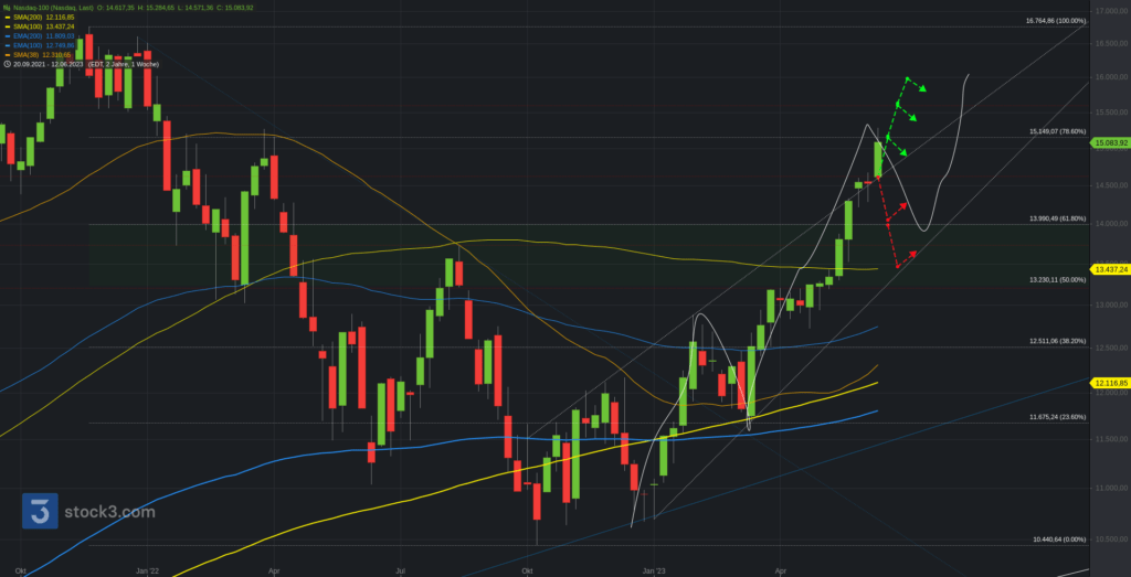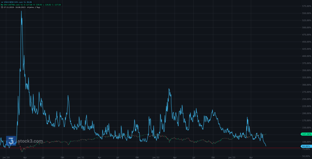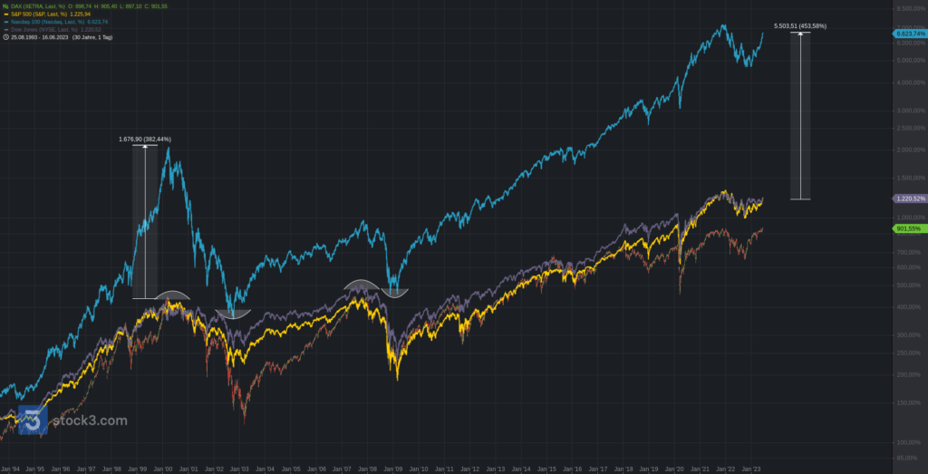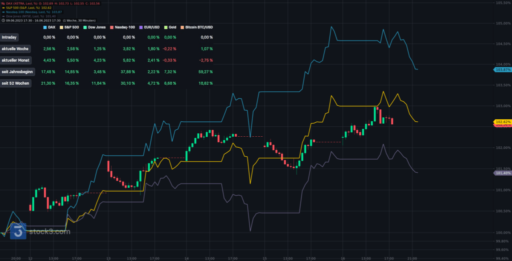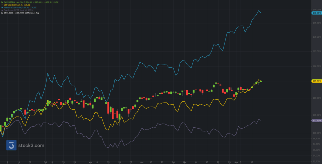 Wir beginnen die Chartreihe mit einem Performancevergleich zwischen Nasdaq100 (blau), S&P500 (gelb), Dow Jones (lila) und DAX seit Jahresbeginn 2023. DAX (+17,48%), S&P500 (+14,85%), Dow Jones (+3,48%) und Nasdaq100 (+37,88).