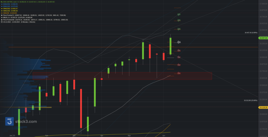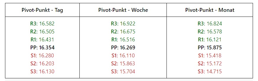 Oberhalb bleibt ein erster Cluster zur .360 aktiv. Darüber folgt bei Stabilisierung ein Angriff auf ein neues AZH bei 16.510. Bei Bruch Chance auf 16.580 und .670. Anschließend 16.760 und .820.