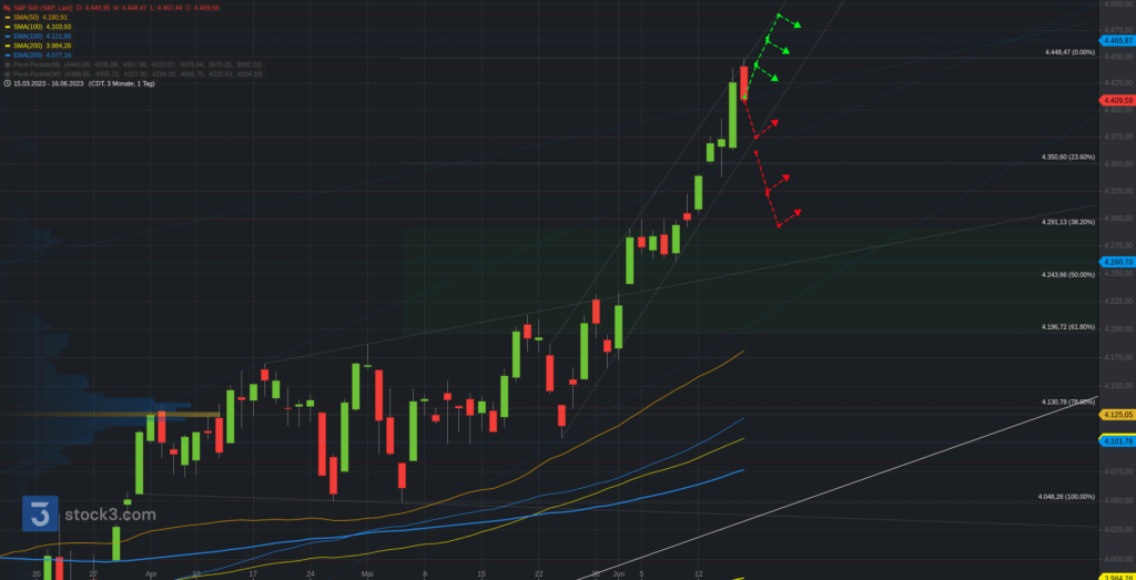 Ein kurzer Blick in den US-Markt (Komplette Updates für den US-Markt gibt es auf Trading-Portal.NET – Premium) ins übergeordnete Bild. Der S&P500 mit über +5% im schwachen Börsenmonat Juni. Die aktuelle Impulsbewegung ist weit ausgedehnt und könnte vor dem Abschluss stehen. Eine Konsolidierung sollte berücksichtigt werden und wird bessere Einstiegsmöglichkeiten bieten. Die 4.410 stellen einen ersten relevanten Bereich. Oberhalb bleibt die Range zur 4.440 aktiv. Darüber weitere Bewegung zur 4.465. Bei Bruch 4.490. Unterhalb rücken hingegen wieder die 4.375 in den Blickpunkt. Darunter könnte die Konsolidierung über die .350 zur .3255 an Fahrt aufnehmen. Bei Bruch 4.3/.290.