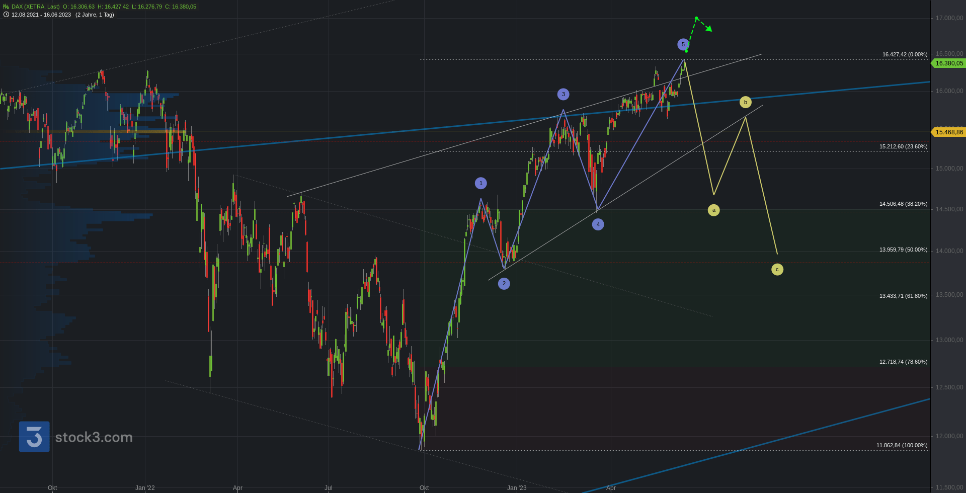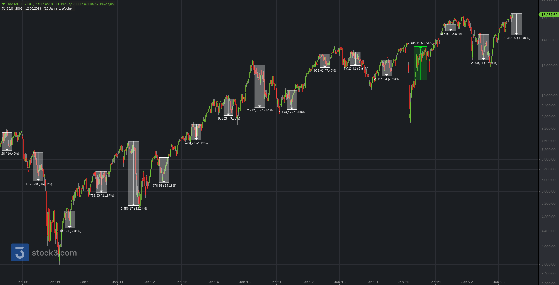 Oberhalb bleibt ein erster Cluster zur .360 aktiv. Darüber folgt bei Stabilisierung ein Angriff auf ein neues AZH bei 16.510. Bei Bruch Chance auf 16.580 und .670. Anschließend 16.760 und .820.