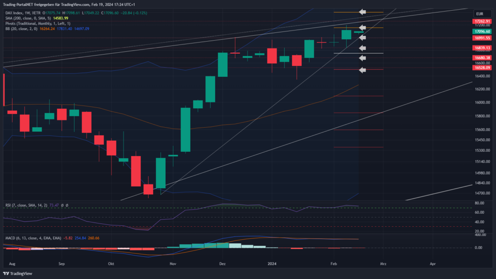 Der Blick auf den Wochenchart, wo der DAX den Herbstanstieg nur bis zum 23,6-er Fibu-Level konsolidierte. Verdächtig flach, was vor allem auf die sehr starke US-Börse zurückzuführen ist, welche der DAX mit seiner Underperformance nicht komplett ignorieren kann. Es muss daher noch eine Fortsetzung der Konso in Richtung der 16k (im bullischen Muster) eingeplant werden. Bei Stabilität oberhalb der 17k bleibt hingegen in kleinen Schritten die Tür zur 17.4 geöffnet. Zwischenmarken wären 17.160/.260/.320. Die 16.850 stellen auf der Unterseite auch weiterhin den ersten Support. Darunter wäre der Cluster über 16.750 zur .680 zu nennen. Bei Bruch dürfte die Konsolidierung zur 16.530/.500 fortgesetzt werden.