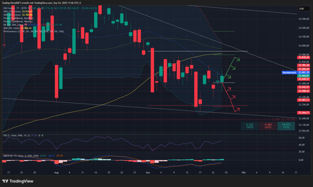 Der DAX etwas im alten Muster, wo Rheinmetall und seine wenigen KI-Werte für etwas Stabilität sorgten. Das m. Bollingerband, welches seit Ende August deckelt, bleibt weiterhin im Fokus. Oberhalb würde die 24k wieder in den Fokus rücken. Abpraller hingegen das Monatstief,