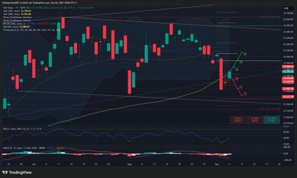 - Unterhalb ist hingegen die Spanne über die 23.660 zur 23.610 weiterhin aktiv. Darunter droht wieder die 23.550 und das Wochentief an der 23.500. Bei Bruch droht weiterer Abgabedruck zur 23.400/.340.